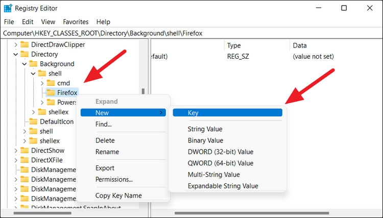 Bước 4: Đặt tên khóa mới là tên ứng dụng bạn muốn hiển thị trên menu chuột phải, ví dụ “Firefox”.