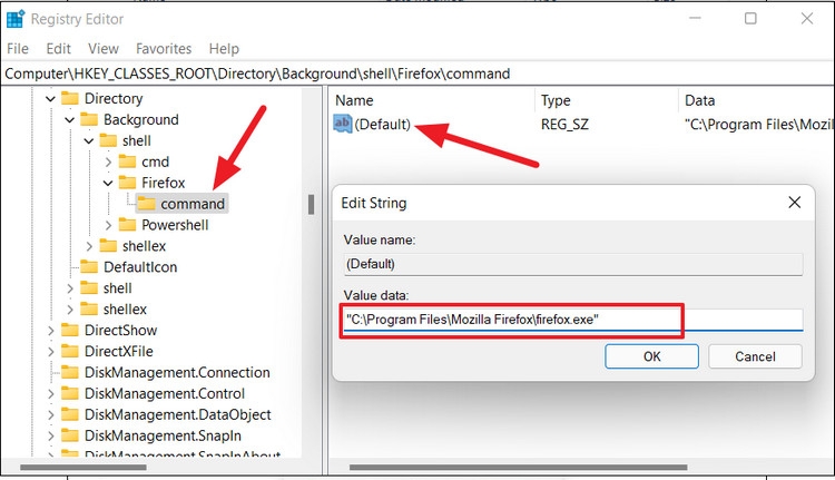 Bước 7: Quay lại Registry Editor, nhấn đúp vào khóa Default bên khung phải, dán đường dẫn vào trường Value data, nhấn OK.