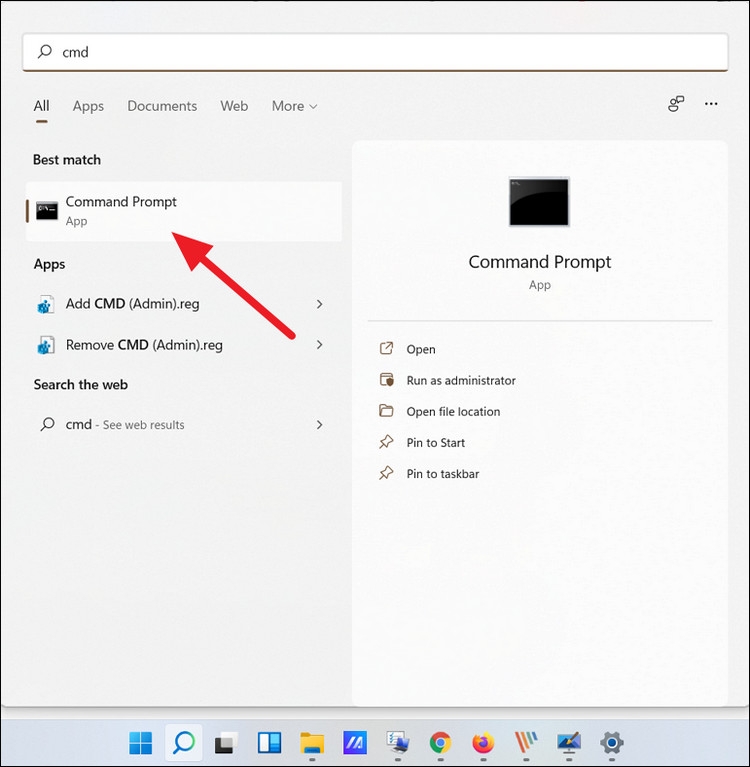 Bước 2: Nhập CMD vào khung tìm kiếm và chọn Command Prompt từ kết quả. Hoặc nhấn Windows + R, nhập CMD, rồi nhấn Enter để mở cửa sổ lệnh.