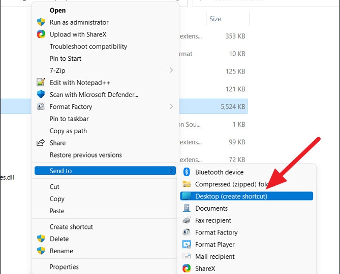 Bước 3: Chọn Send to > Desktop (create shortcut). Ngoài ra, bạn có thể sao chép tệp (Ctrl+C) và dán trực tiếp ra desktop.