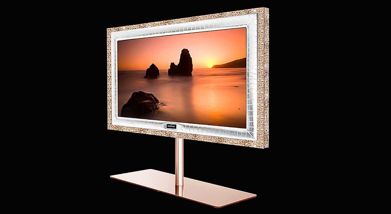 Đứng đầu danh sách là Stuart Hughes Prestige HD Supreme Rose Edition, được xem là chiếc tivi đắt tiền nhất thế giới với giá trị lên tới 2,26 triệu USD (hơn 54 tỷ đồng). Chiếc tivi xa xỉ này được chế tác thủ công từ 28kg vàng và vàng hồng 18K, đính 72 viên kim cương, cùng khung viền bọc da cá sấu cao cấp. Ngoài ra, phần thân máy còn được trang trí bằng đá quý Sunstone và Amethyst, biến nó trở thành một tác phẩm nghệ thuật thực thụ – nơi công nghệ và sự xa hoa cùng tồn tại.