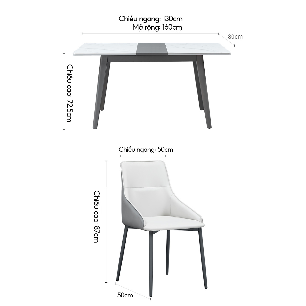 Để phục vụ cho những bàn ăn đông người, bộ bàn ghế ăn mặt đá phiến Chivas Modern Light PT027 có thể dễ dàng tùy chỉnh chiều ngang lên tới 30cm chỉ với 4 bước vô cùng đơn giản. Để mở rộng bàn ăn, bạn chỉ cần kéo mặt bàn sang 2 bên, sau đó xoay phần mặt bàn ở giữa lên, đẩy 2 bên mặt bàn lại sao cho khớp với phần mặt bàn mở rộng là đã có thể sử dụng. Để thu gọn bàn ăn trở về kích thước ban đầu, bạn chỉ cần làm ngược lại các bước trên vô cùng đơn giản.