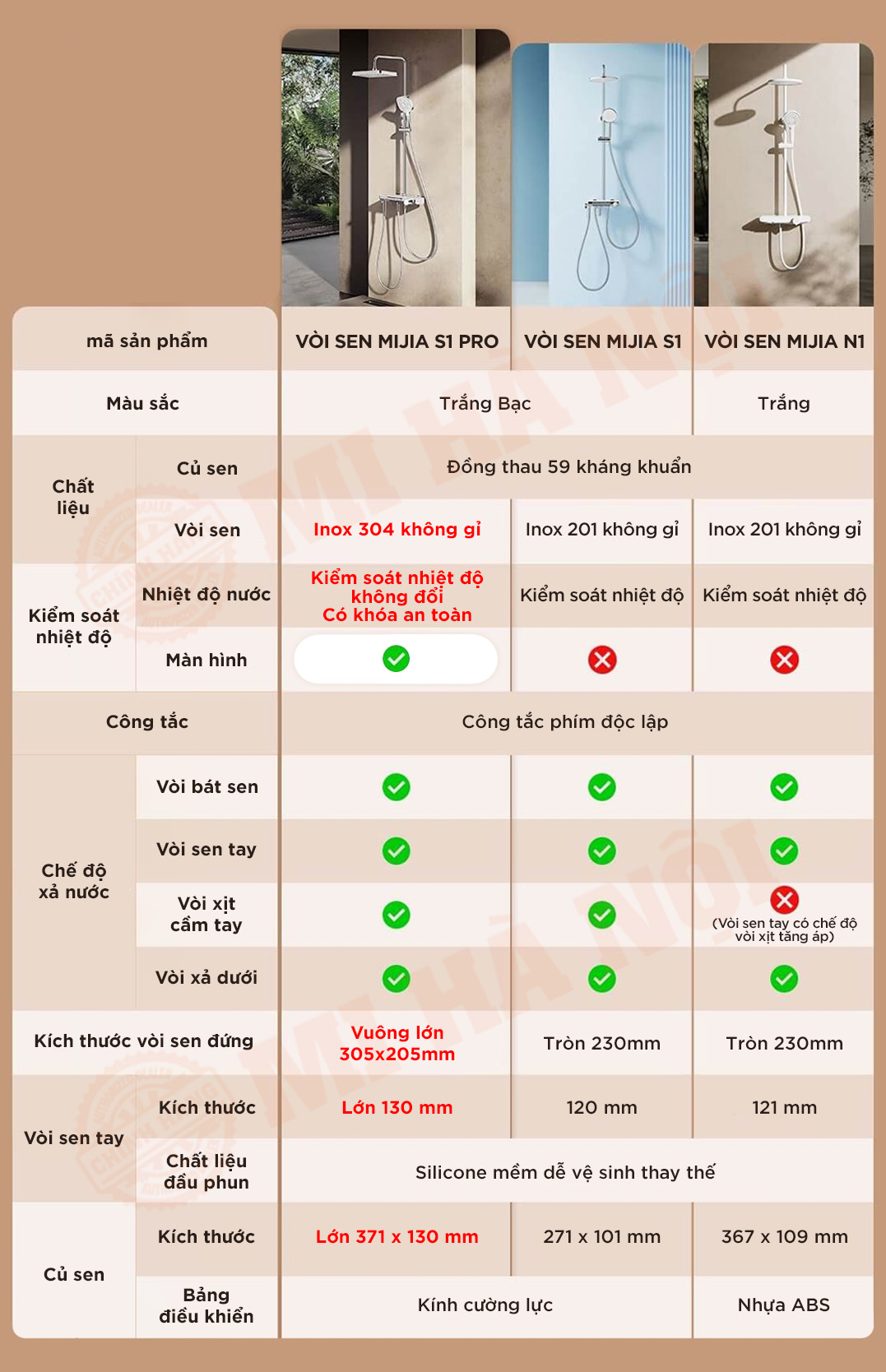 Bảng so sánh các mẫu Vòi Sen Mijia