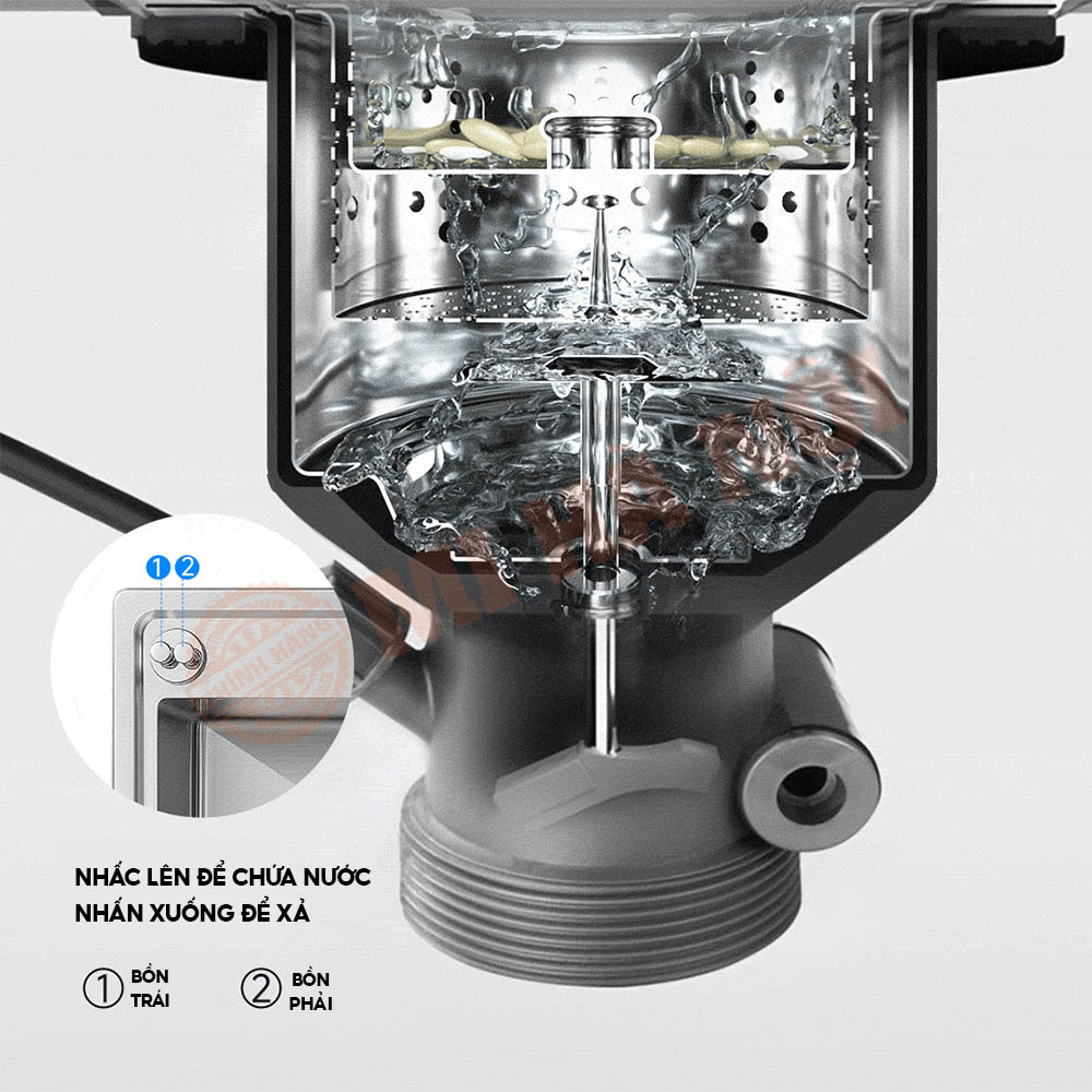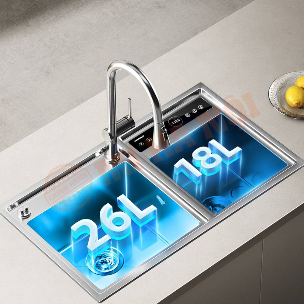 Chậu rửa bát thông minh có hai nút điều khiển riêng biệt, một để chứa nước và một để xả nước, giúp người dùng dễ dàng thao tác chỉ với một cú nhấp chuột.