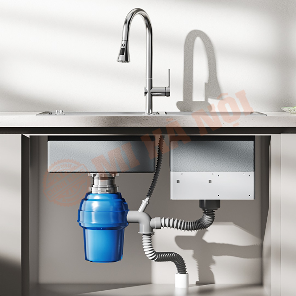 Bồn rửa chén thông minh 2 ngăn cũng hỗ trợ lắp đặt máy xử lý rác, trở thành đối tác lý tưởng để dọn dẹp sau bữa ăn. Giao diện cống thoát nước có thể tương thích với nhiều loại máy xử lý rác, tận dụng tối đa không gian dưới quầy bếp. Đường kính trong của cống là 114mm, phù hợp với hầu hết các máy xử lý rác có sẵn trên thị trường. Lưu ý rằng máy xử lý rác cần được mua riêng.