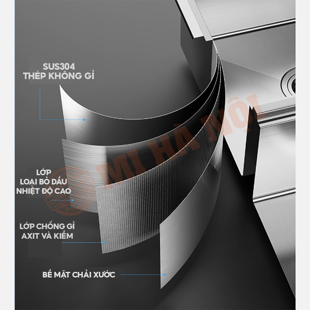 Bề mặt Bồn rửa chén thông minh Xiaomi Higold được làm bằng quy trình kéo dây thép không gỉ, hông sợ trầy xước kể cả khi sử dụng hàng ngày. Ngoài ra, bồn rửa thông minh còn có khả năng chống ăn mòn và trông như mới sau khi sử dụng lâu dài. Kết cấu 4 lớp: