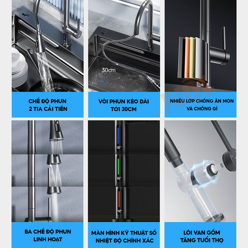 Đặc biệt vòi phun kĩ thuật số có thêm Màn hình kỹ thuật số thông minh kiểm soát nhiệt độ chính xác. Loại vòi kéo này có chức năng hiển thị kỹ thuật số không cần lắp pin. Nguồn điện sẽ được tạo ra từ dòng nước chảy ra từ vòi.