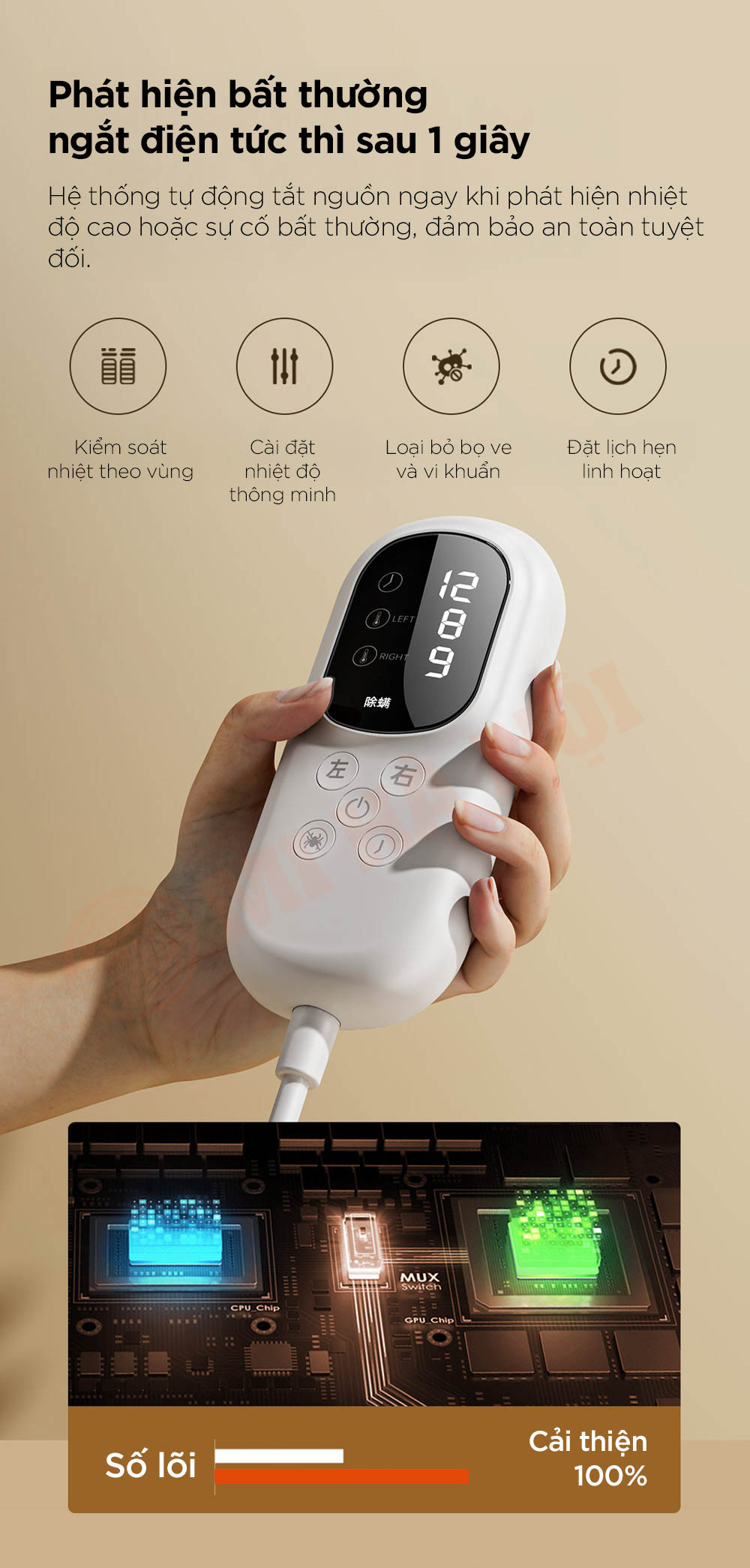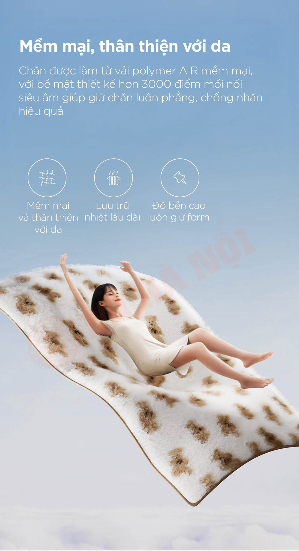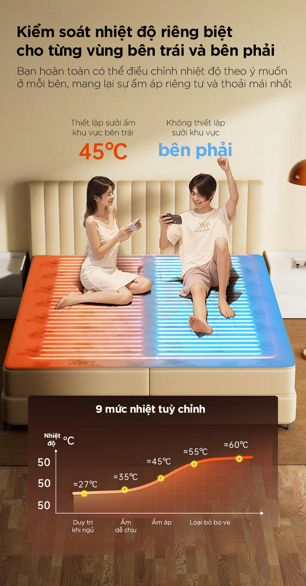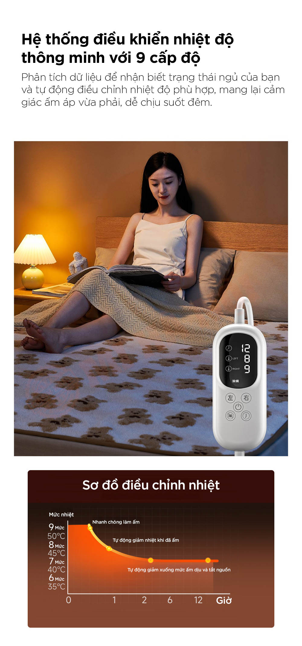 • 9 mức nhiệt độ linh hoạt, điều chỉnh từ ấm nhẹ đến ấm sâu, đáp ứng nhiều nhu cầu từ thư giãn, giữ ấm đến giúp ngủ sâu hơn trong ngày lạnh.