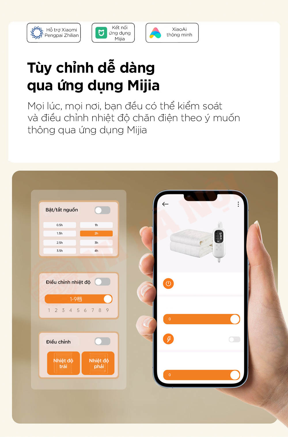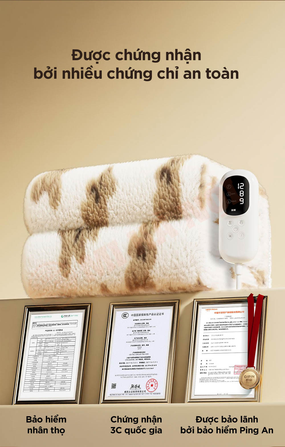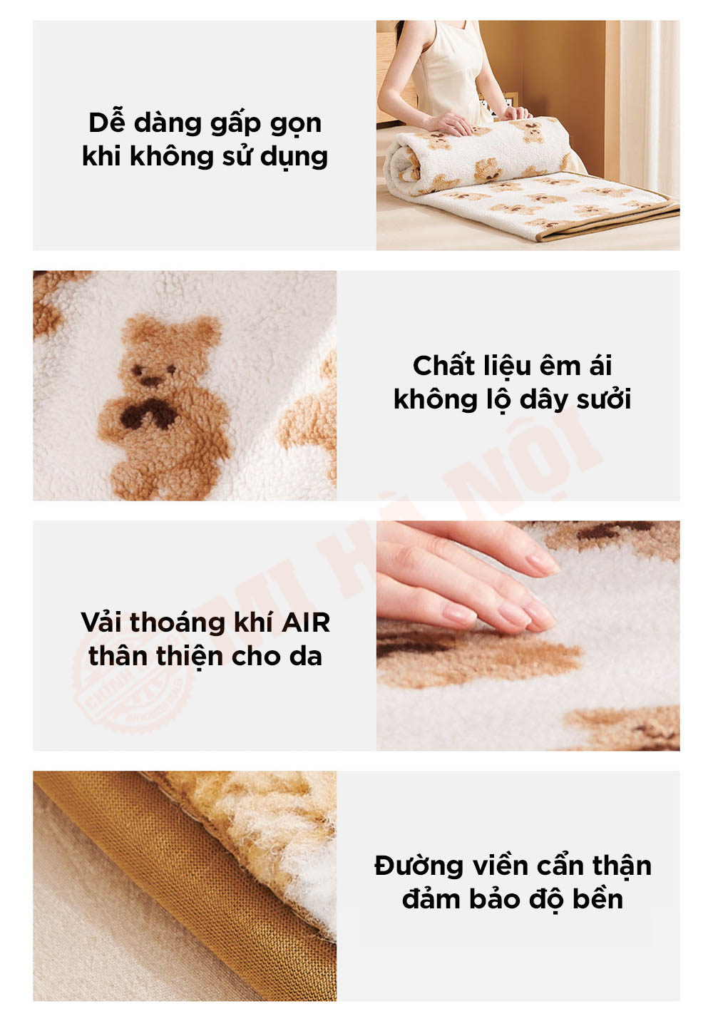 • 9 mức nhiệt độ linh hoạt, điều chỉnh từ ấm nhẹ đến ấm sâu, đáp ứng nhiều nhu cầu từ thư giãn, giữ ấm đến giúp ngủ sâu hơn trong ngày lạnh.