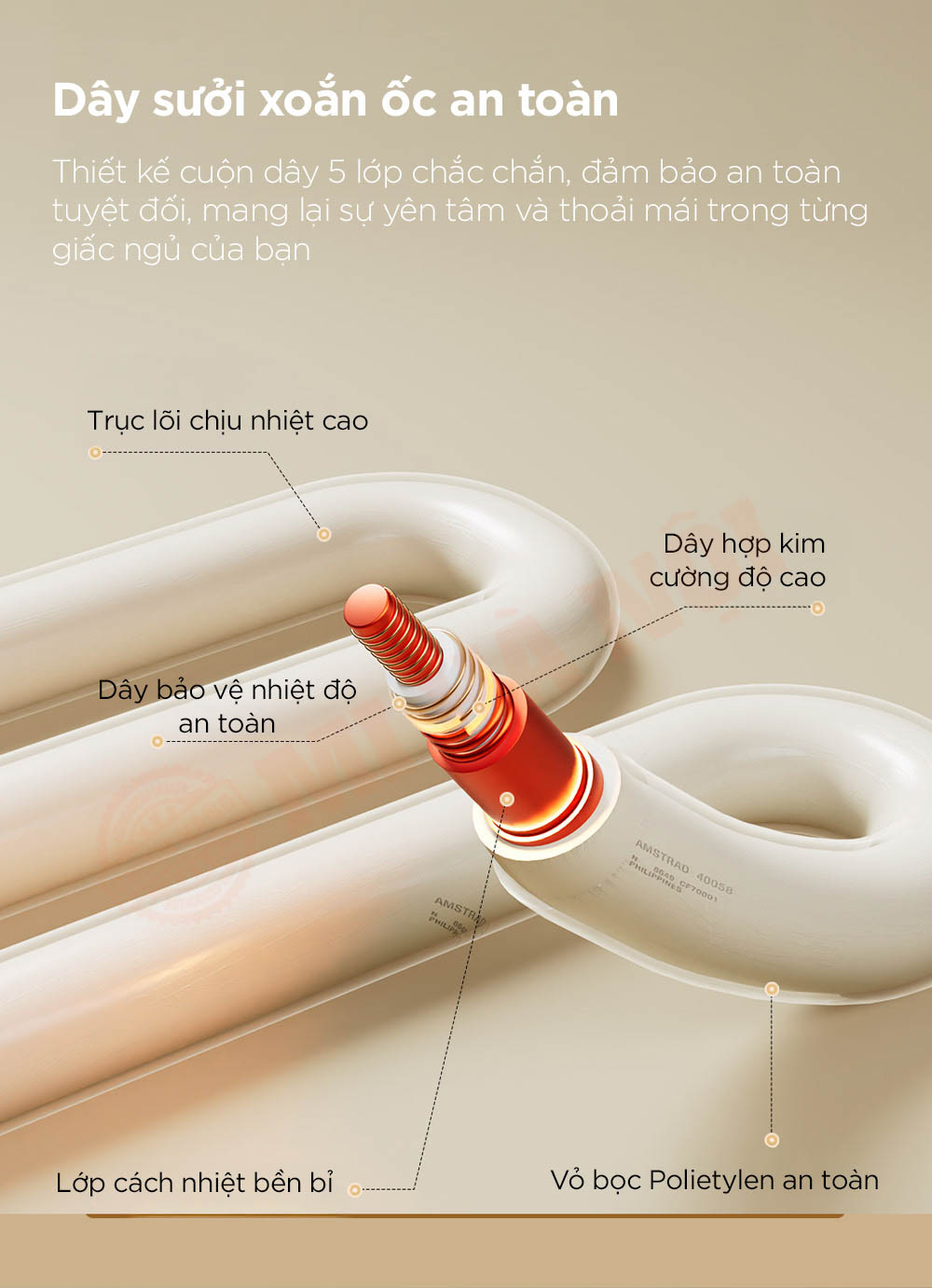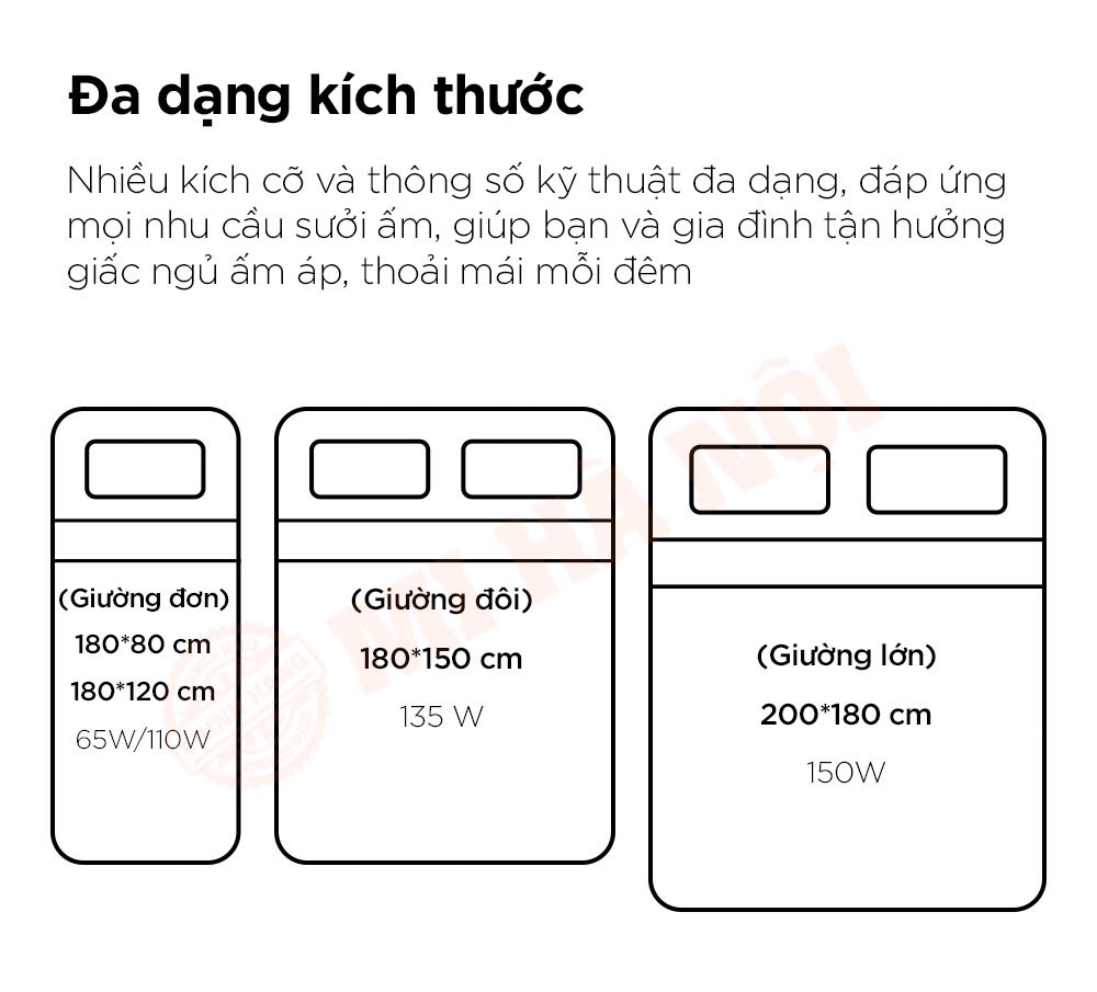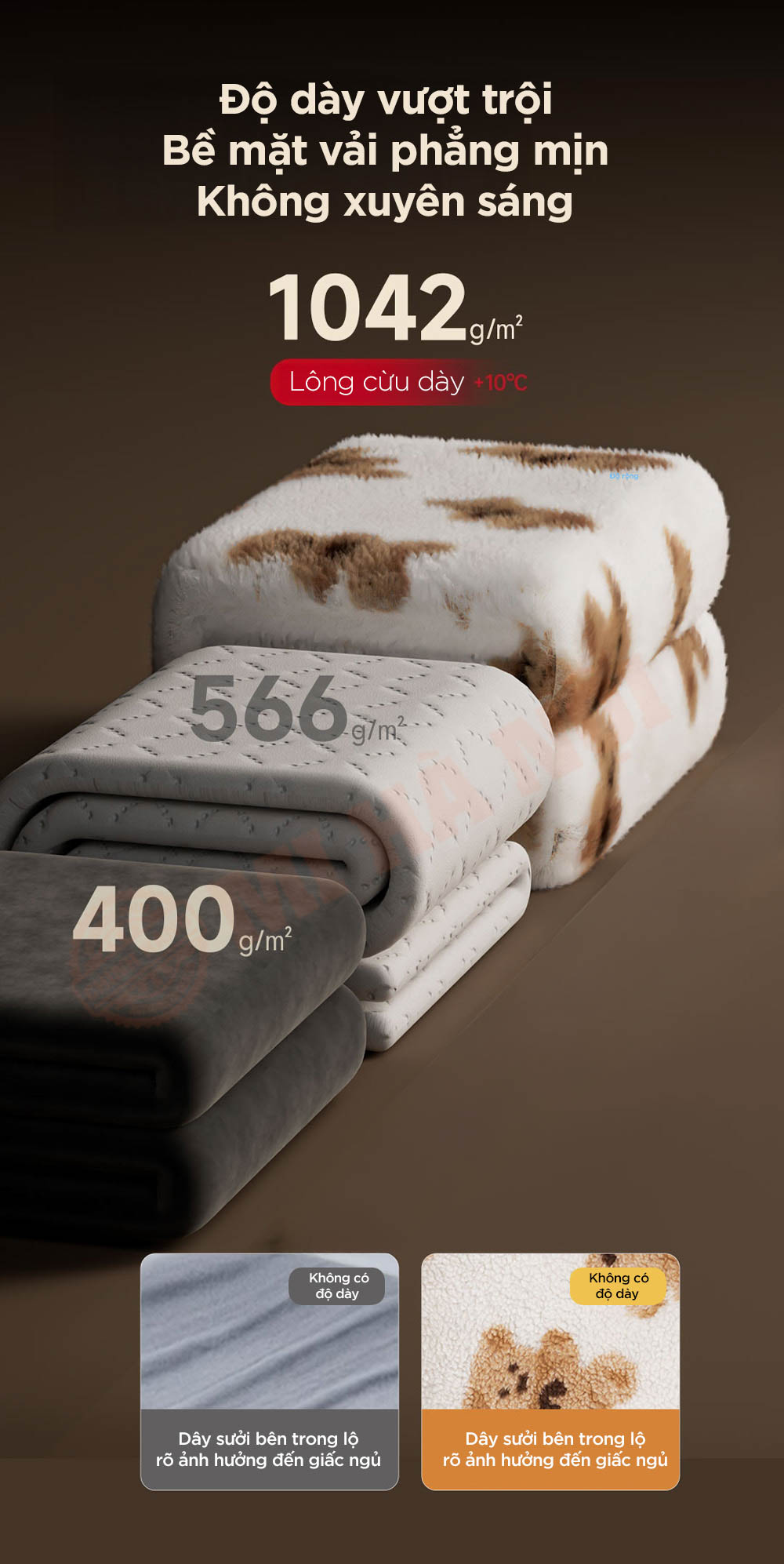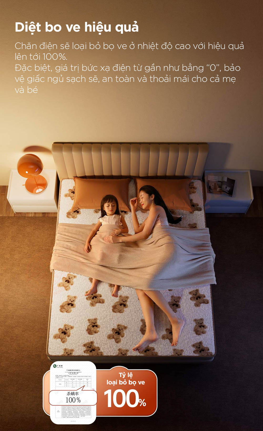 • 9 mức nhiệt độ linh hoạt, điều chỉnh từ ấm nhẹ đến ấm sâu, đáp ứng nhiều nhu cầu từ thư giãn, giữ ấm đến giúp ngủ sâu hơn trong ngày lạnh.