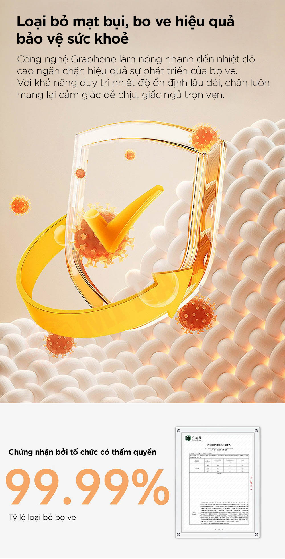 - Loại bỏ 99,99% vi khuẩn, bọ ve ở nhiệt độ cao