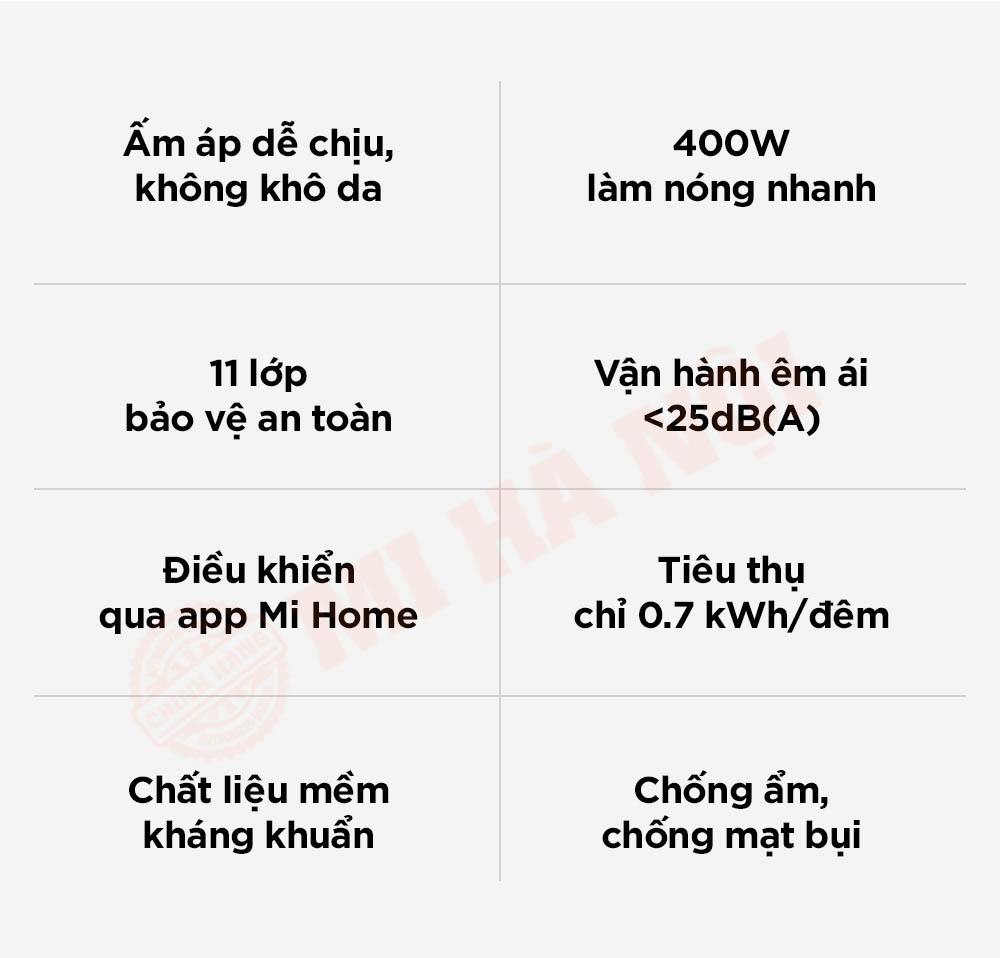 - Lõi gốm công suất 400W làm nóng nhanh, truyền nhiệt đều khắp chăn.