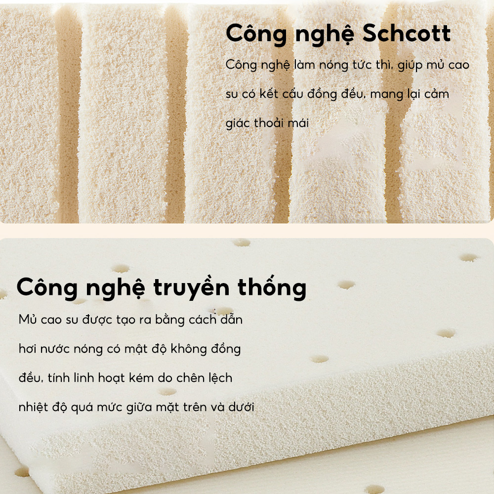 Công nghệ mủ cao su mới của Schcott, có nguồn gốc từ Ý, là công nghệ tạo xốp mủ cao su thế hệ thứ 3, sử dụng công nghệ tần số vô tuyến không dây để làm nóng tức thì toàn bộ mủ từ trong ra ngoài, giúp phát huy tối đa các đặc tính ưu việt của mủ Thái Lan. Sản phẩm cao su thành phẩm có kết cấu dày đặc, bong bóng đều và độ đàn hồi hoàn hảo.