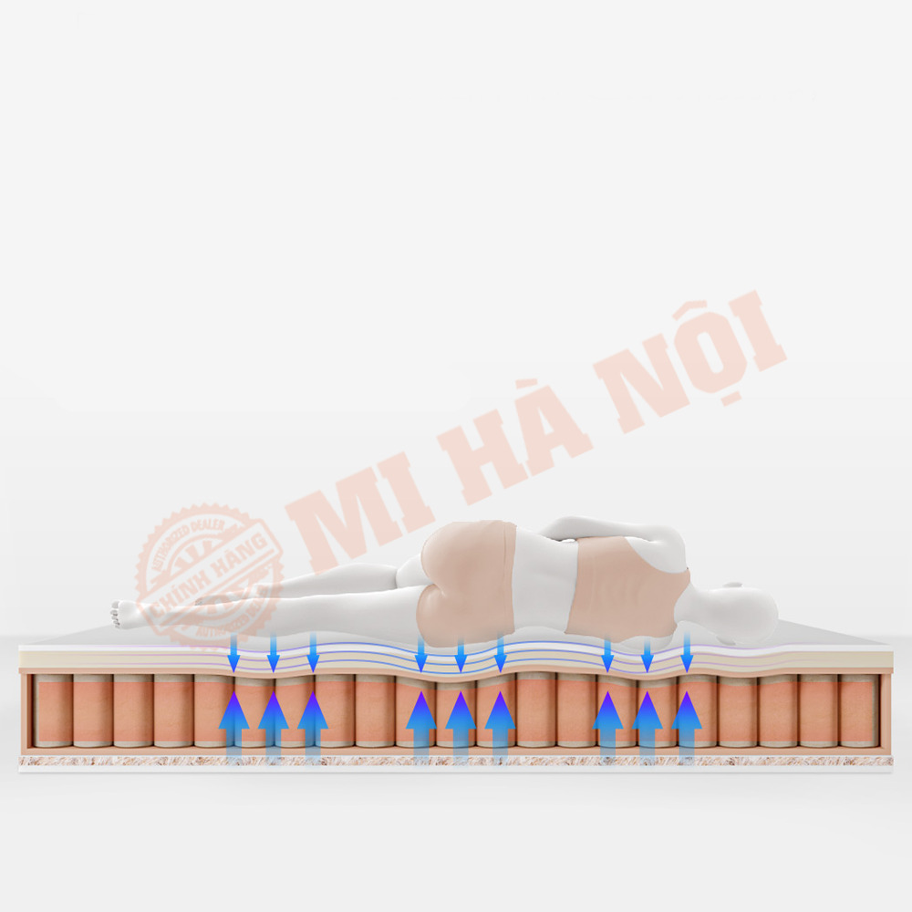 Với kích thước rộng 1,8m, nệm này tích hợp 350 túi lò xo độc lập, linh hoạt co giãn theo trọng lượng và hình dáng của cơ thể. Điều này giúp nệm nâng đỡ cơ thể một cách nhẹ nhàng và chính xác khi bạn đang ngủ, tạo cảm giác thoải mái và hỗ trợ tối ưu cho các điểm tiếp xúc cơ thể với nệm.