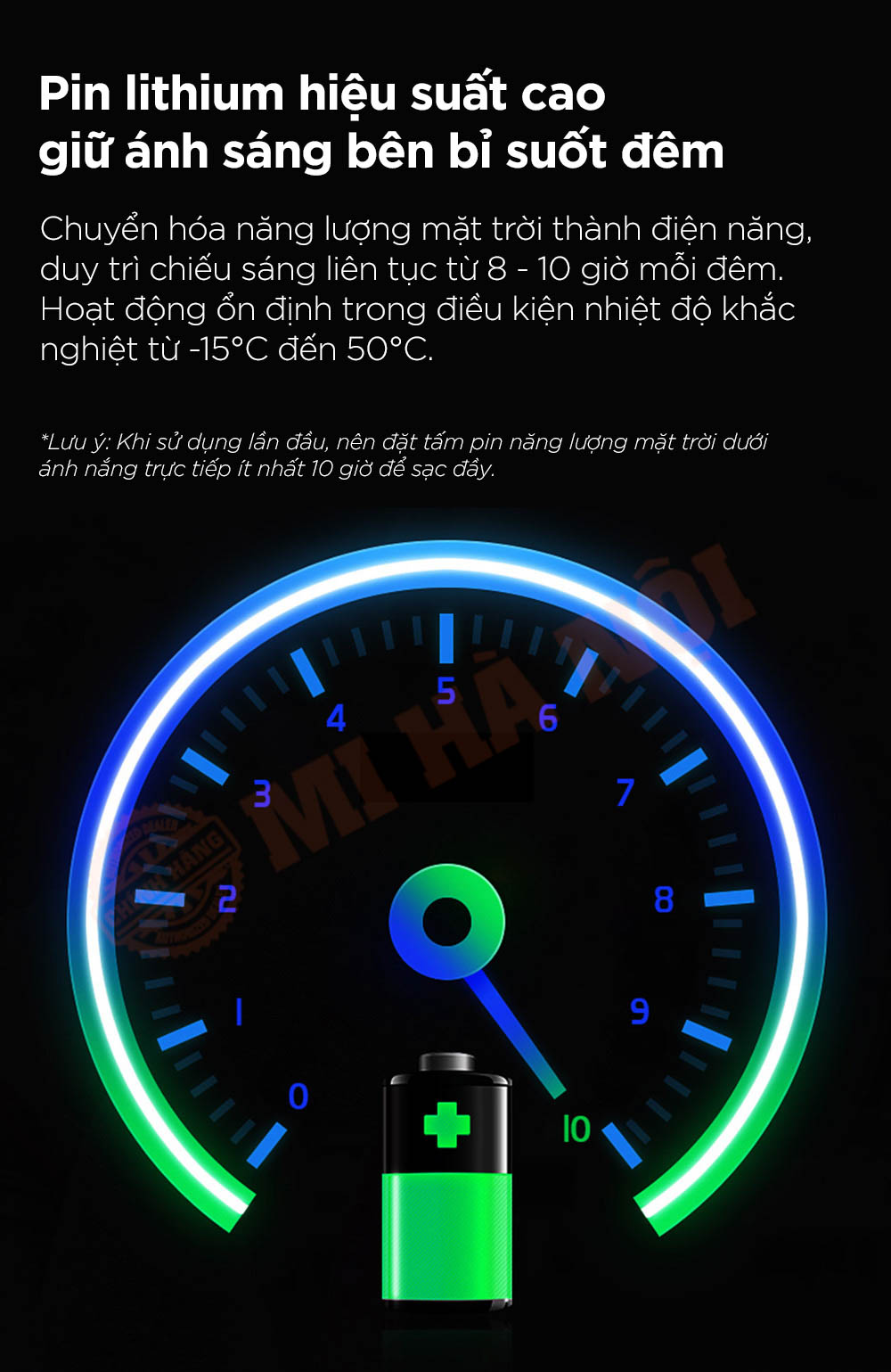 - Pin lithium hiệu suất cao giữ ánh sáng bên bỉ liên tục từ 8 đến 10 giờ