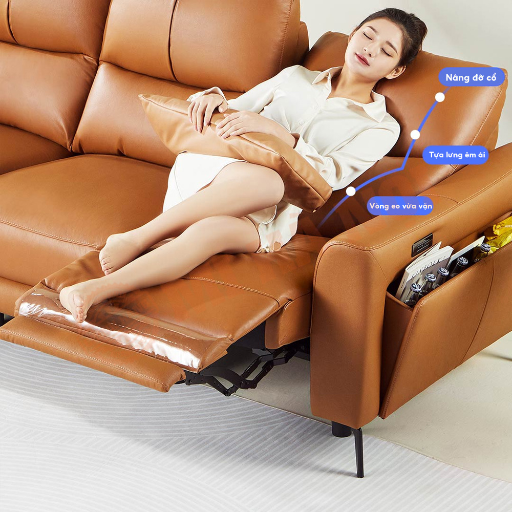 Ghế sofa điện 3 chỗ 8H được làm từ chất liệu da bò thật chất lượng cao phong cách Ý cùng 2 vị trí kê chân tiện lợi sẽ mang lại những giây phút thư giãn, nghỉ ngơi thoải mái nhất cho bạn và gia đình.