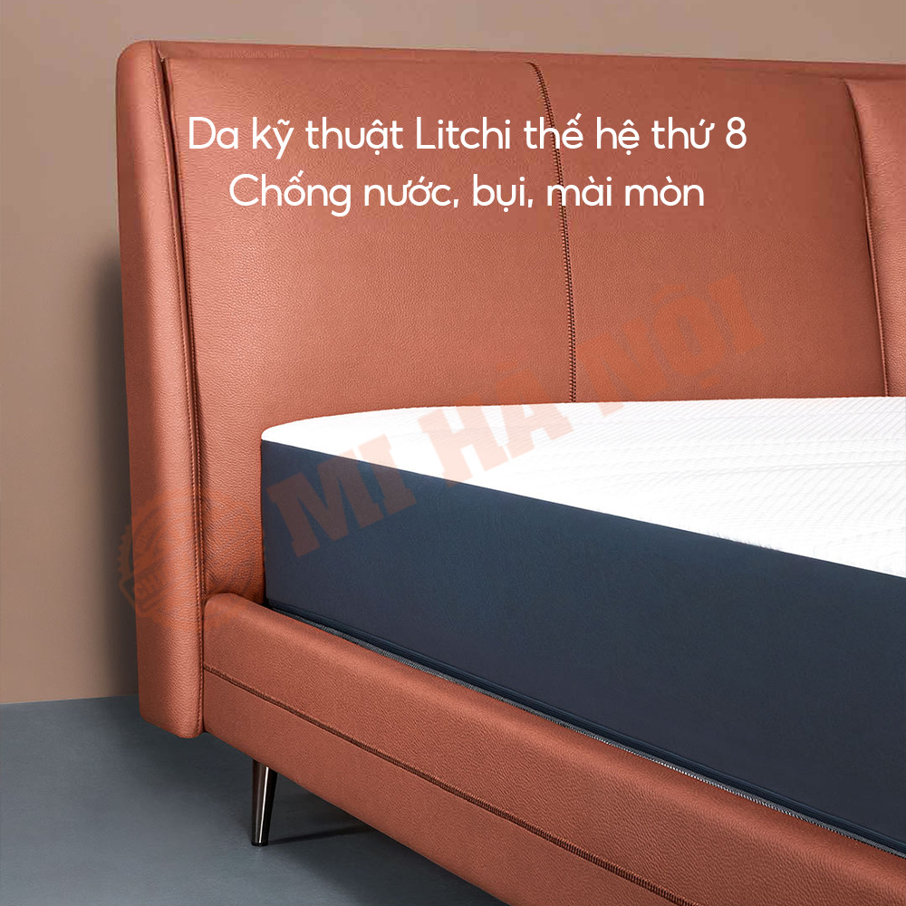 Phần da bọc đầu giường và xung quanh giường được làm từ chất liệu da kỹ thuật Litchi thế hệ thứ tám, có kết cấu và cảm giác giống hệt da thật. Da litchi thoáng khí và có thể chống mài mòn, chống nước, chống dầu, chống bám bẩn, vô cùng thân thiện với da người.