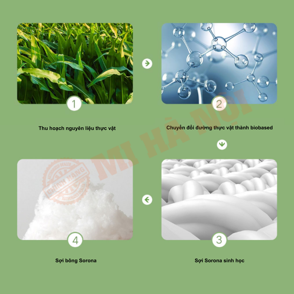 Gối PF3 được sản xuất từ sợi Dupont Sorona, một vật liệu thân thiện với môi trường. Nguyên liệu thô cho sợi này được chiết xuất từ thực vật và là vật liệu sinh khối có khả năng tái tạo. Đây là một sản phẩm xanh, sử dụng công nghệ sạch, an toàn với môi trường và không gây hại cho sức khỏe của người dùng, đặc biệt là cho trẻ sơ sinh và trẻ nhỏ.