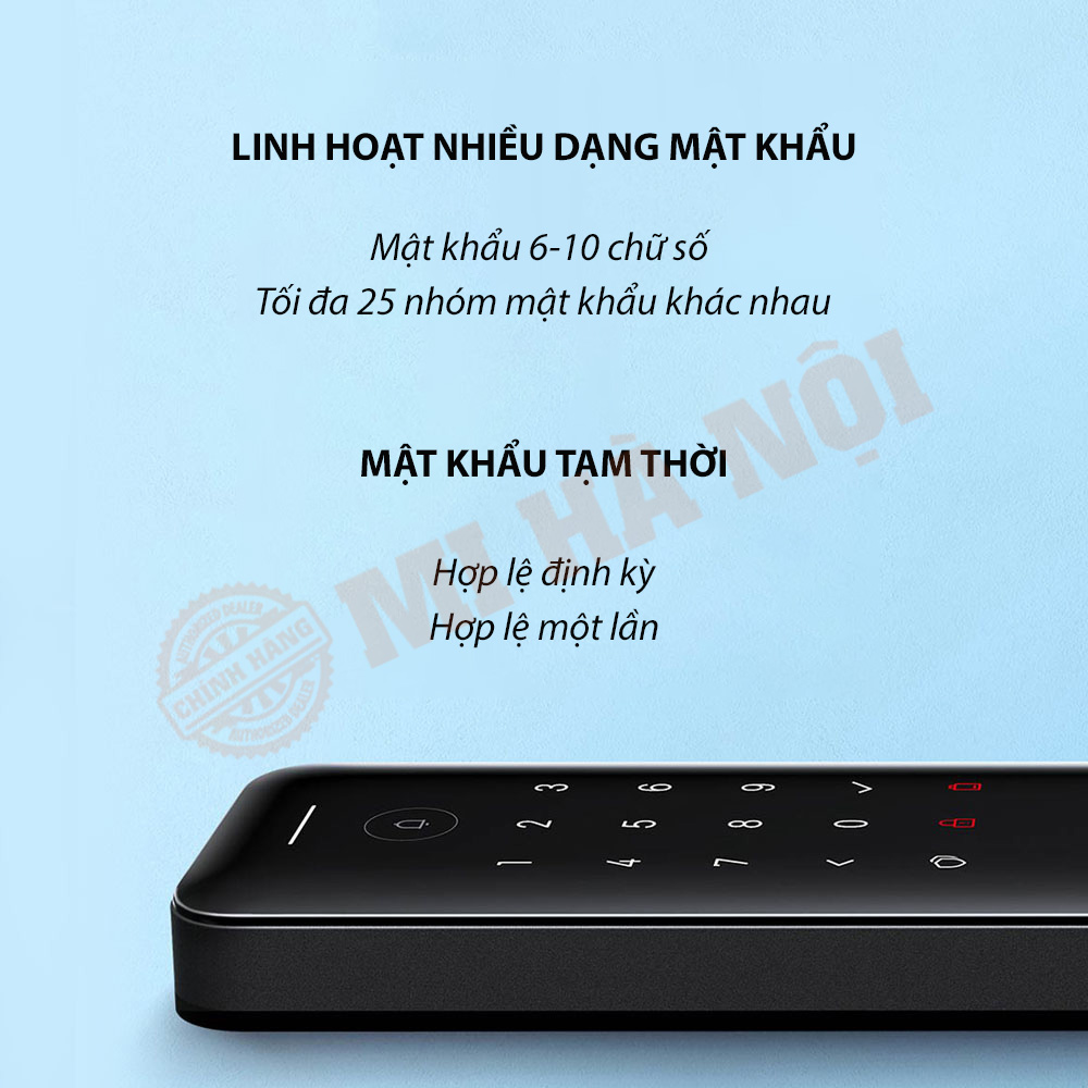Hỗ trợ nhiều dạng mật khẩu để dễ dàng linh hoạt trong nhiều tình huống khác nhau khi cần mở khóa cửa. Nhiều dạng mật khẩu được chấp nhận đáp ứng điều kiện mật khẩu 6-10 chữ số và có thể tạo tối đa 25 nhóm mật khẩu khác nhau. Ngoài ra còn có thể tạo mật khẩu tạm thời trong các tình huống đặc thù.