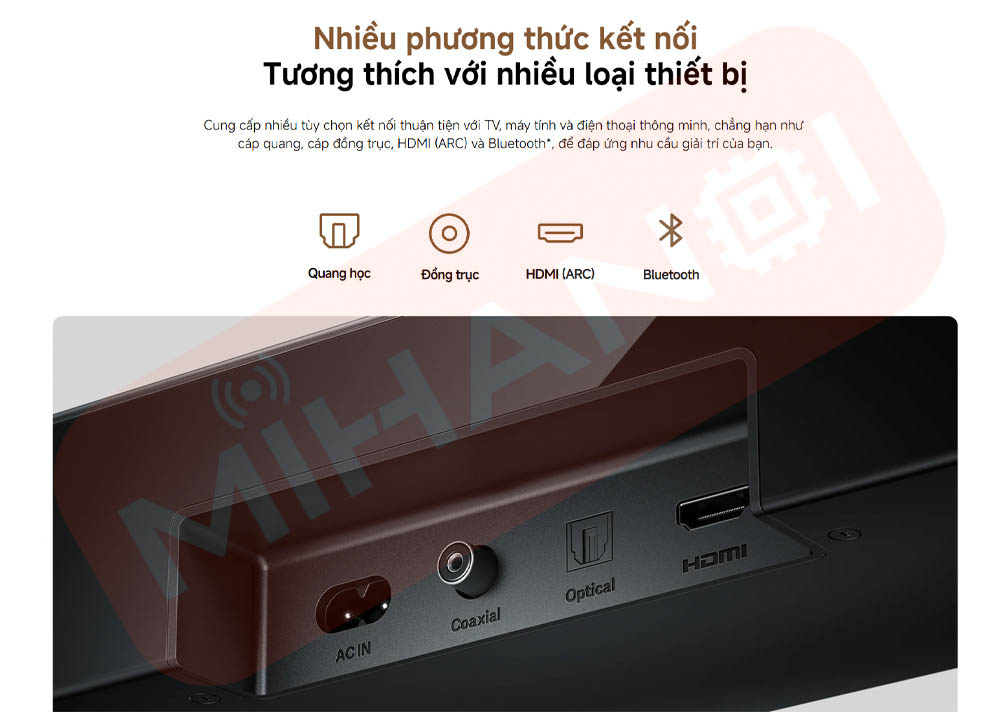 - Hỗ trợ đa dạng cổng kết nối như Optical, Coaxial, HDMI (ARC) và Bluetooth, tương thích linh hoạt với TV, máy tính và điện thoại.