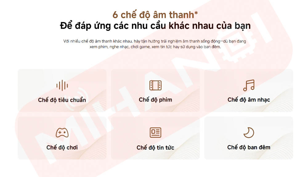 - 6 chế độ âm thanh đa dạng phù hợp cho xem phim, nghe nhạc, chơi game, tin tức hay ban đêm.
