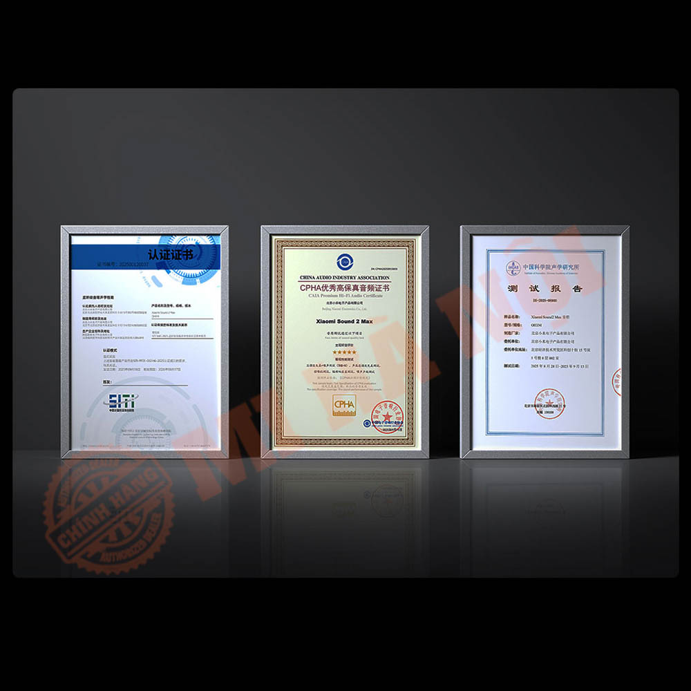Loa Xiaomi Sound 2 Max đạt chứng nhận hiệu suất loa giám thính từ Viện Đo lường Trung Quốc, tuân thủ tiêu chuẩn hiệu suất âm học của Viện Âm học – Viện Hàn lâm Khoa học Trung Quốc, được CPHA chứng nhận loa cao cấp chân thực, đồng thời vượt qua kiểm tra đáp tuyến tần số theo tiêu chuẩn ANSI/CTA-2034-A.