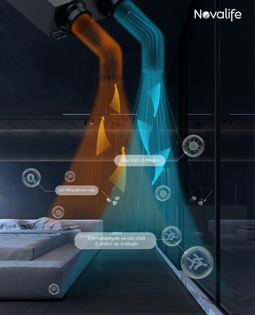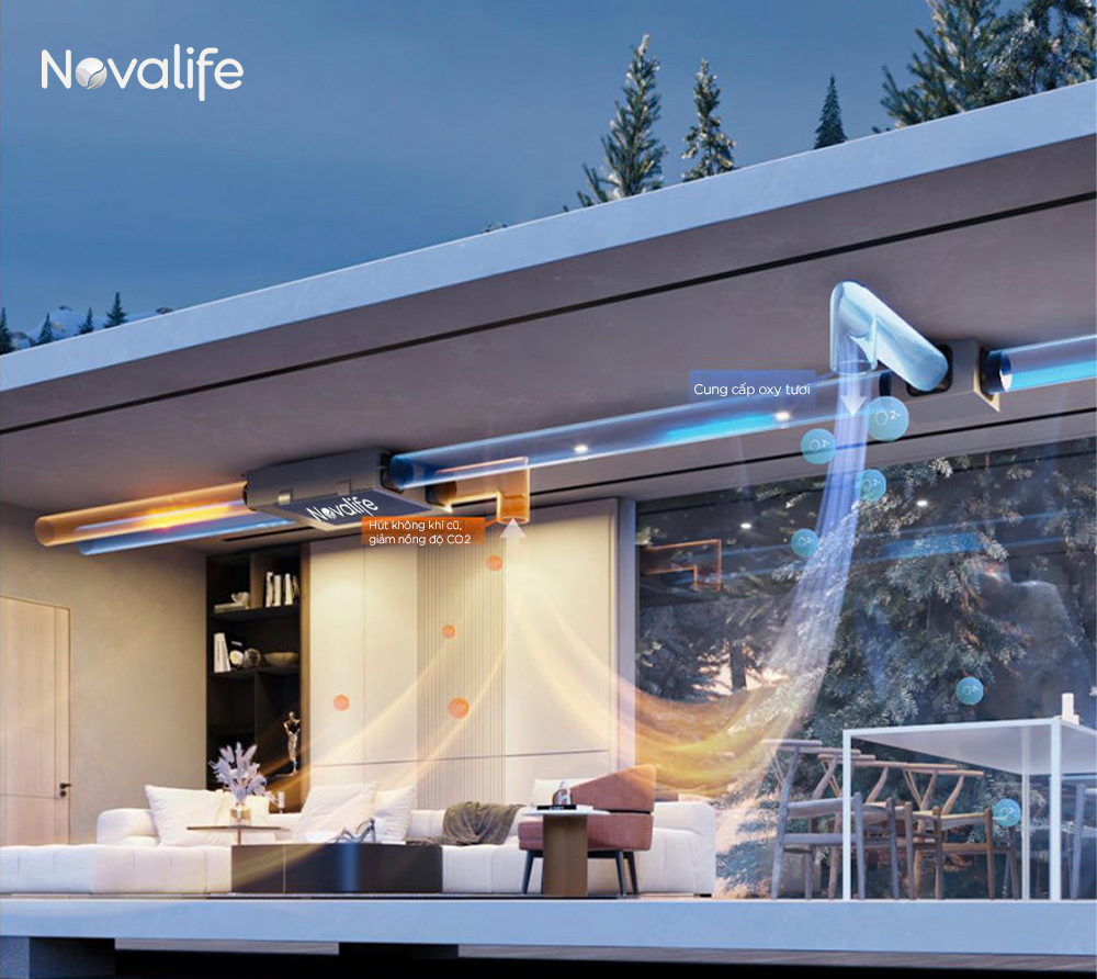Trong khí đó, máy lọc không khí cũng chỉ lọc lại không khí cũ, không giải quyết được bài toán thiếu oxy và tích tụ CO₂. Giải pháp cần thiết nhất chính là cấp khí tươi sạch từ bên ngoài vào trong nhà, đồng thời đẩy khí ô nhiễm ra ngoài – đúng theo cách mà hệ thống cấp khí tươi trung tâm Novalife vận hành.