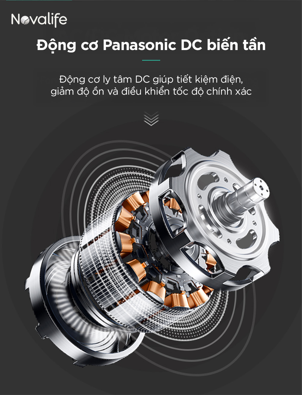 Novalife KMC-50THP được trang bị động cơ cao cấp, bền bỉ của Panasonic giúp máy không chỉ tiết kiệm điện mà còn vận hành êm ái, tuổi thọ cao. Động cơ DC biến tần nổi bật với khả năng: