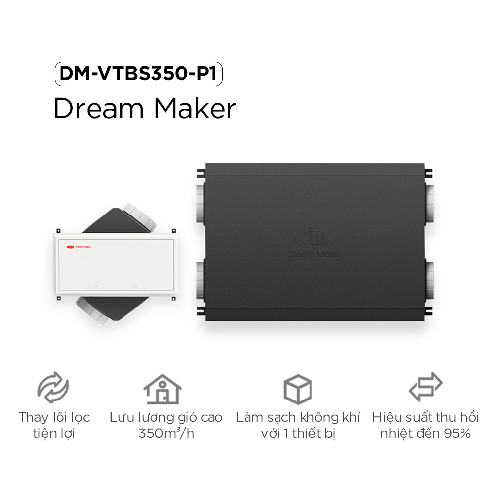 Máy cấp khí tươi trung tâm Dream Maker DM-VTBS350-P1 giải pháp thông gió và trao đổi không khí hiệu quả, mang đến môi trường sống trong lành và thoáng đãng. Sản phẩm có lưu lượng gió 350 m³/h, hoạt động êm ái với độ ồn ≤ 45 dB(A). Thiết kế màu xám sang trọng, kích thước gọn nhẹ, dễ tích hợp vào trần nhà giúp nâng cao chất lượng không khí mà vẫn giữ tính thẩm mỹ cho không gian. Với hiệu suất ổn định và tiêu chuẩn chất lượng cao, DM-VTBS350-P1 là lựa chọn thông minh cho hệ thống khí tươi trung tâm.