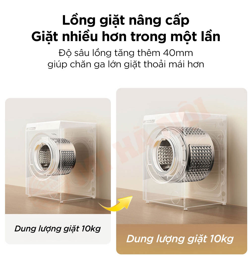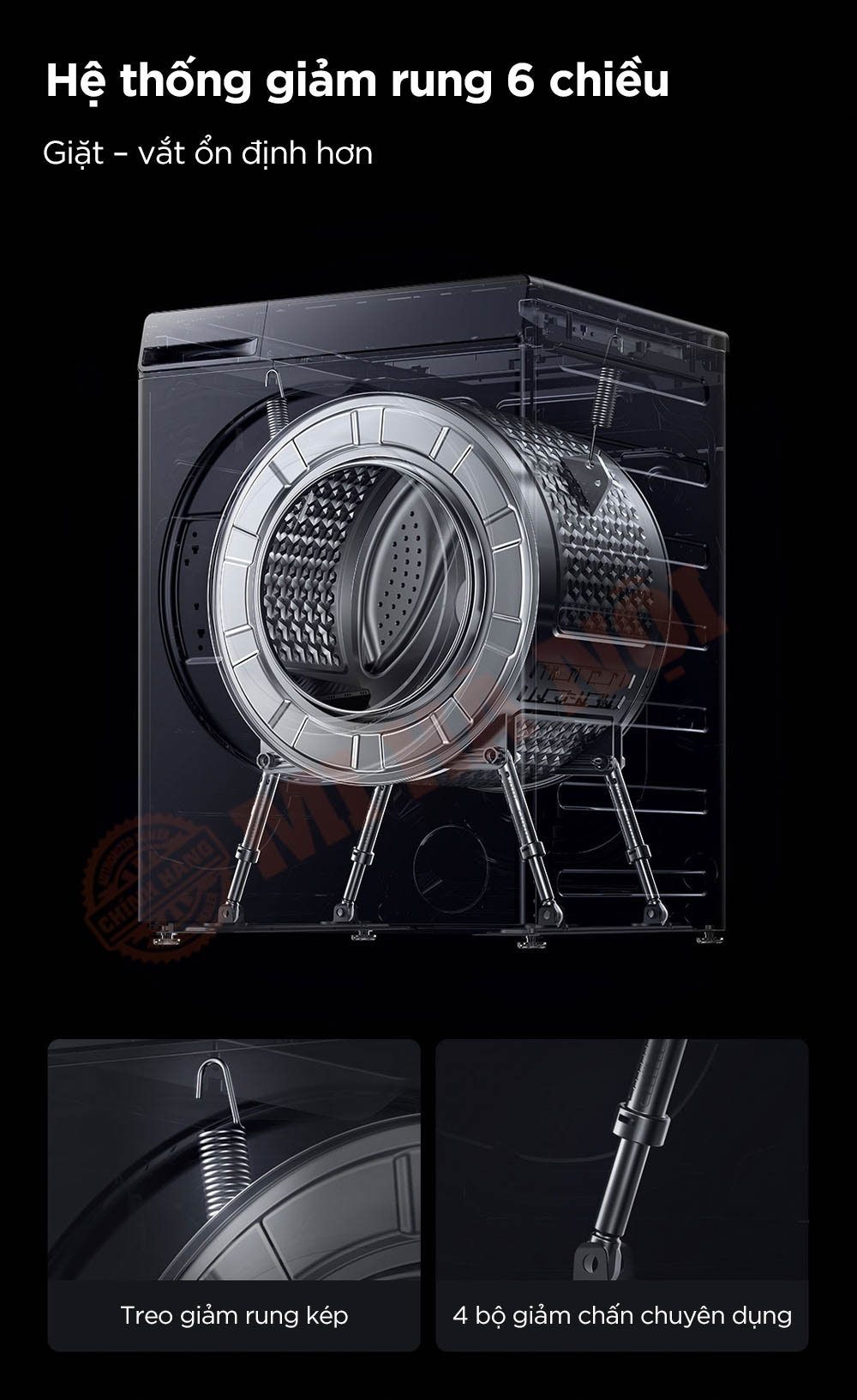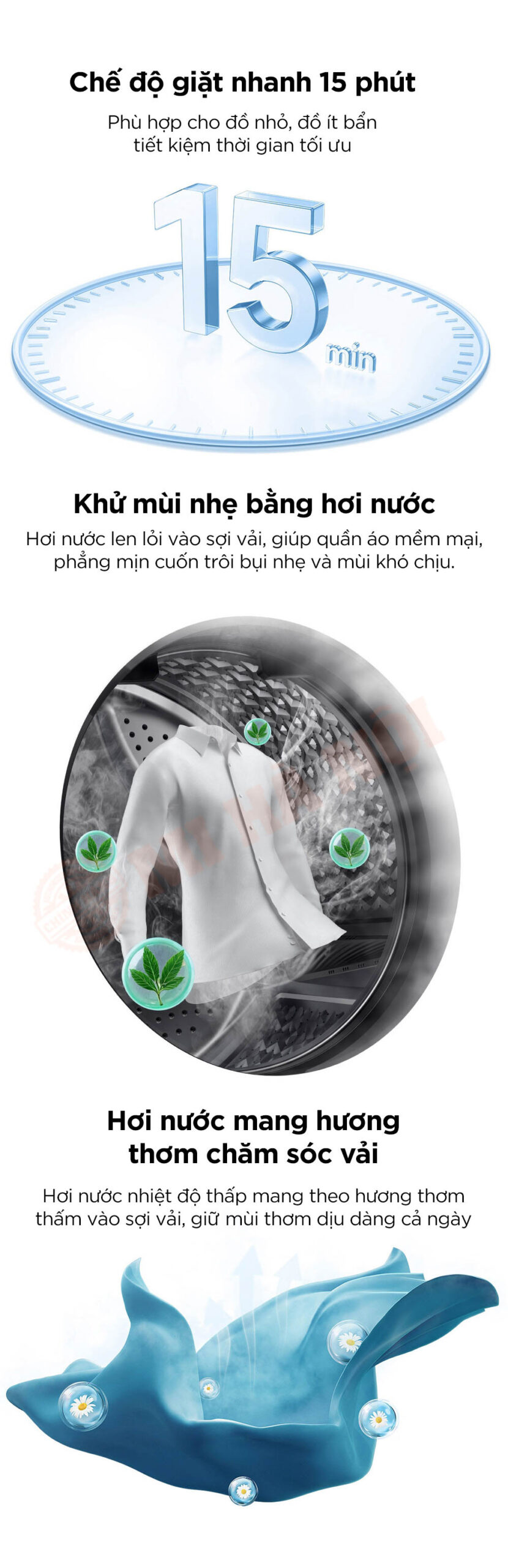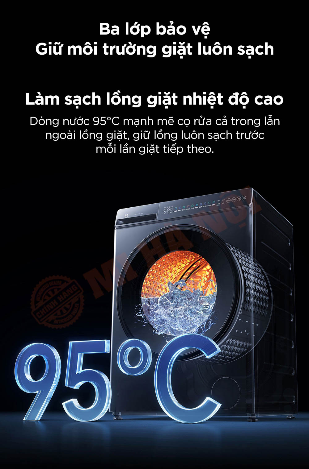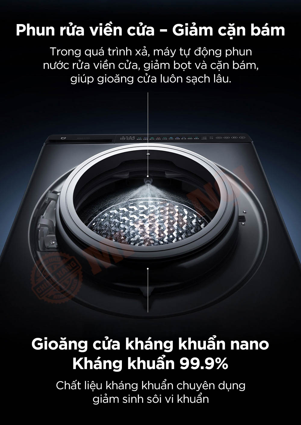 - Lồng giặt luôn sạch nhờ giặt lồng 95°C, phun rửa viền cửa và gioăng kháng khuẩn 99.9%.