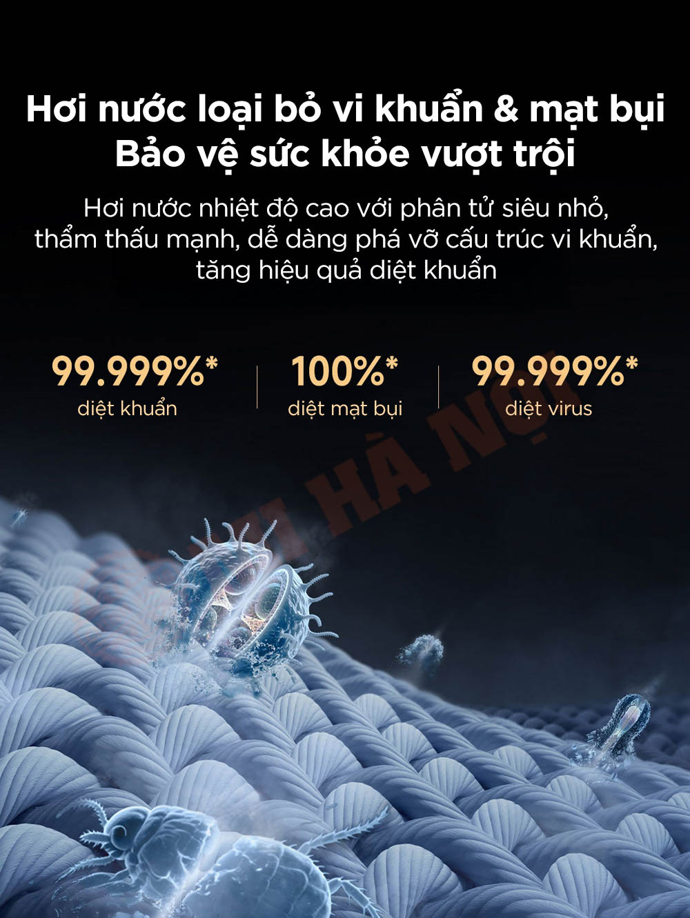 - Hơi nước nhiệt độ cao diệt khuẩn – diệt mạt – diệt virus hiệu quả đến 99.999%.