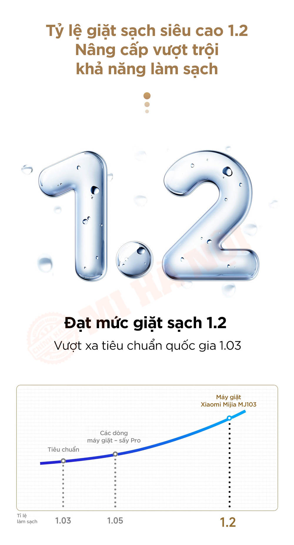- Máy giặt đạt hiệu suất giặt sạch 1.2, vượt xa tiêu chuẩn quốc gia 1.03.