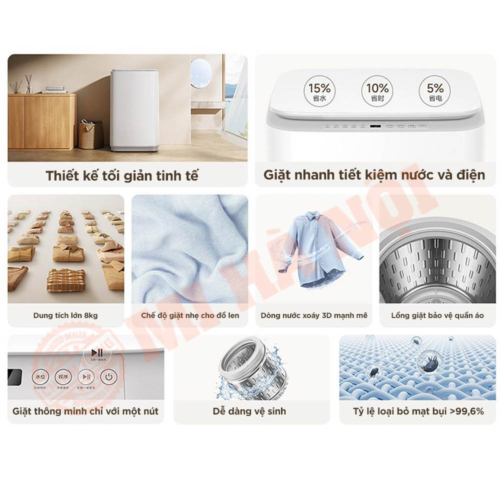 Máy giặt Xiaomi Mijia MJ106 8kg mang đến trải nghiệm giặt giũ tiện lợi và thông minh. Với thiết kế tối giản, dung tích lớn, giặt sạch vượt trội và nhiều tính năng tiết kiệm điện nước, máy còn tích hợp khởi động nhanh, hẹn giờ 24h, giảm nhăn quần áo và khóa an toàn trẻ em – lựa chọn lý tưởng cho gia đình hiện đại.