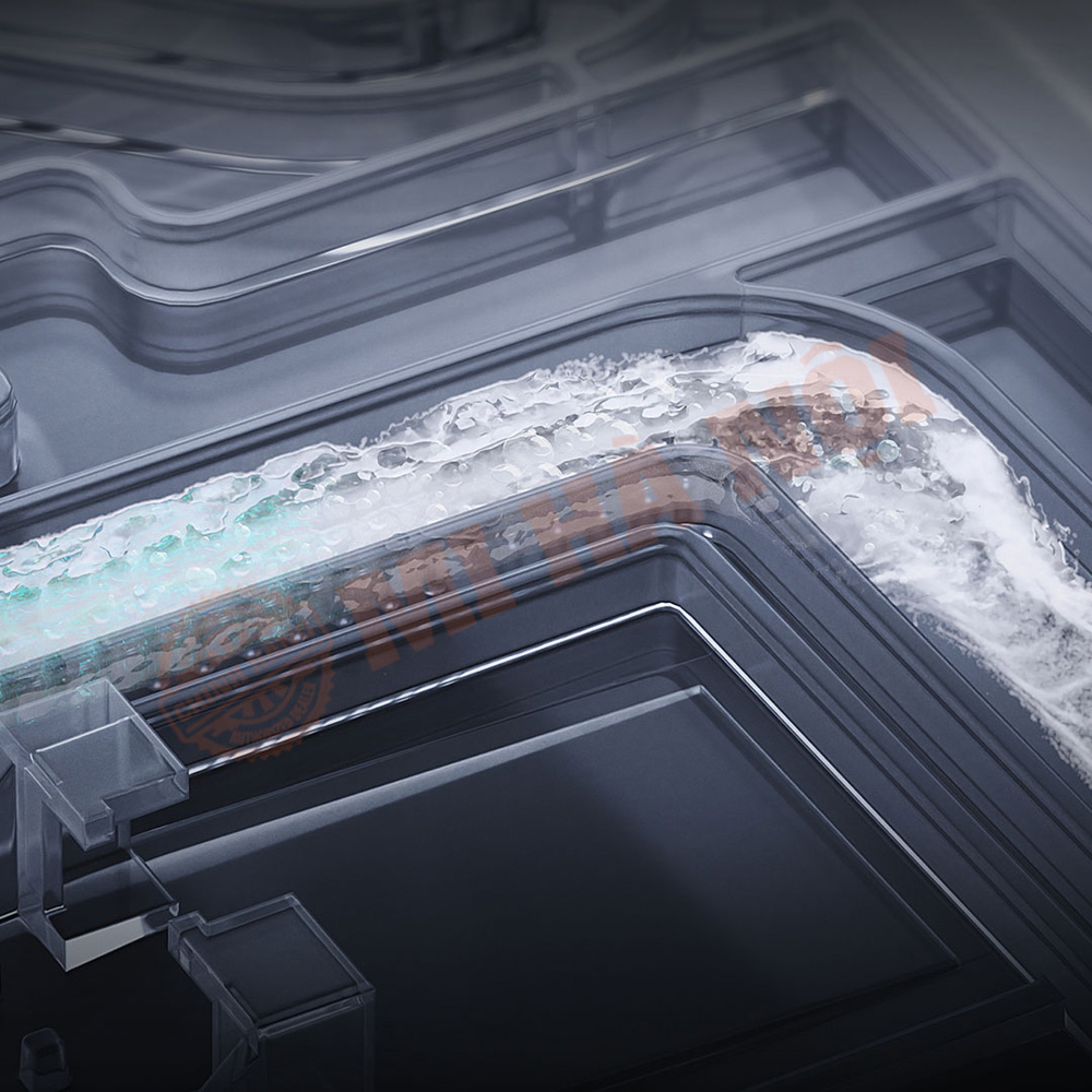 Trong quá trình vận hành, cửa máy giặt sẽ được đóng kín hoàn toàn, sau đó tự động phun và rửa bằng nước sạch để loại bỏ bọt xà phòng bám trên bề mặt, đảm bảo vệ sinh cho từng lần giặt.
