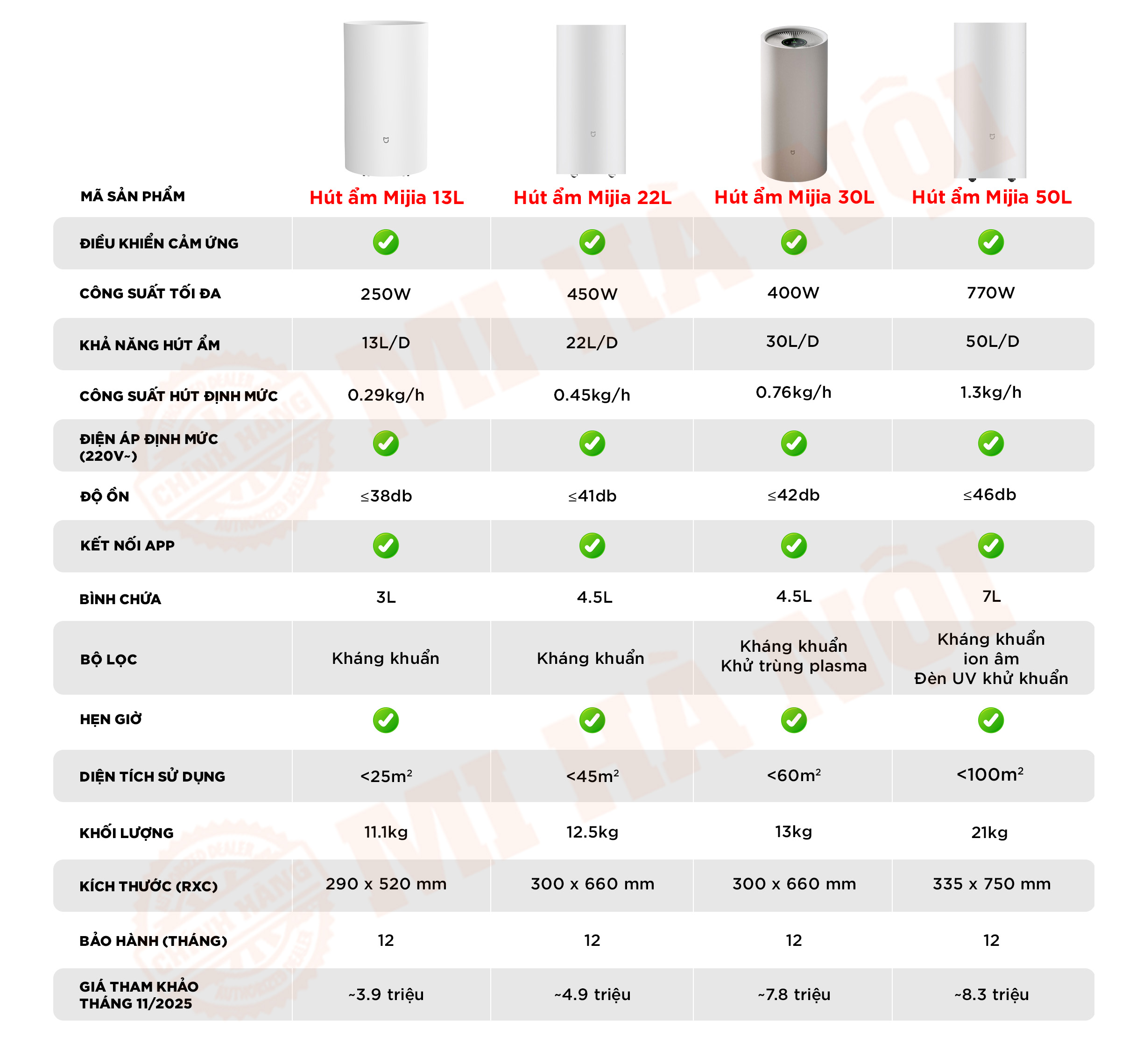 Bảng so sánh các mẫu máy hút ẩm thông minh Mijia