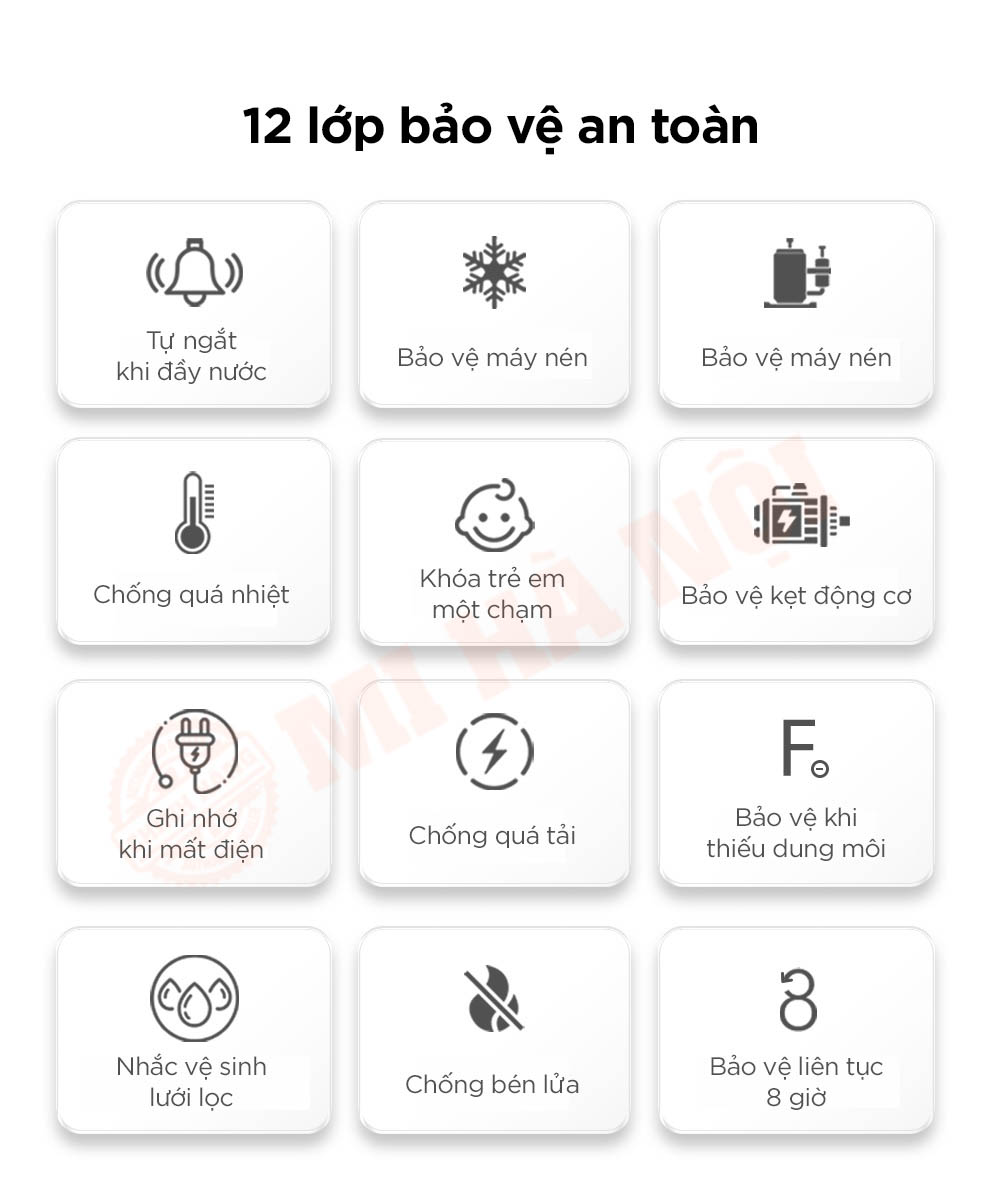 - Hệ thống 12 lớp bảo vệ an toàn gồm chống quá nhiệt, chống quá tải, khóa trẻ em một chạm, nhắc vệ sinh lưới lọc và chống cháy.