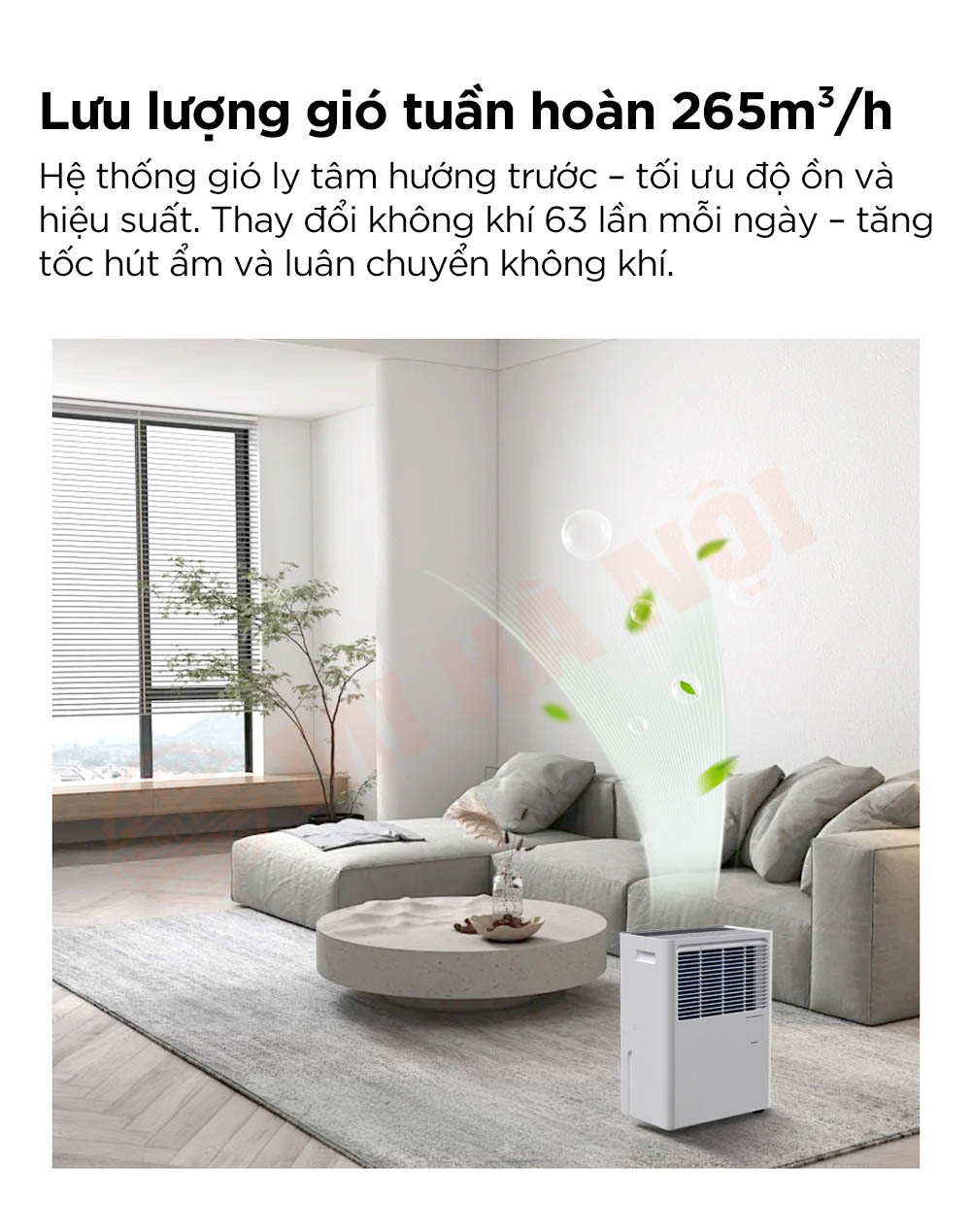 - Lưu lượng gió tuần hoàn 265m³/h với hệ thống gió ly tâm hướng trước, tối ưu hiệu suất và độ ồn.