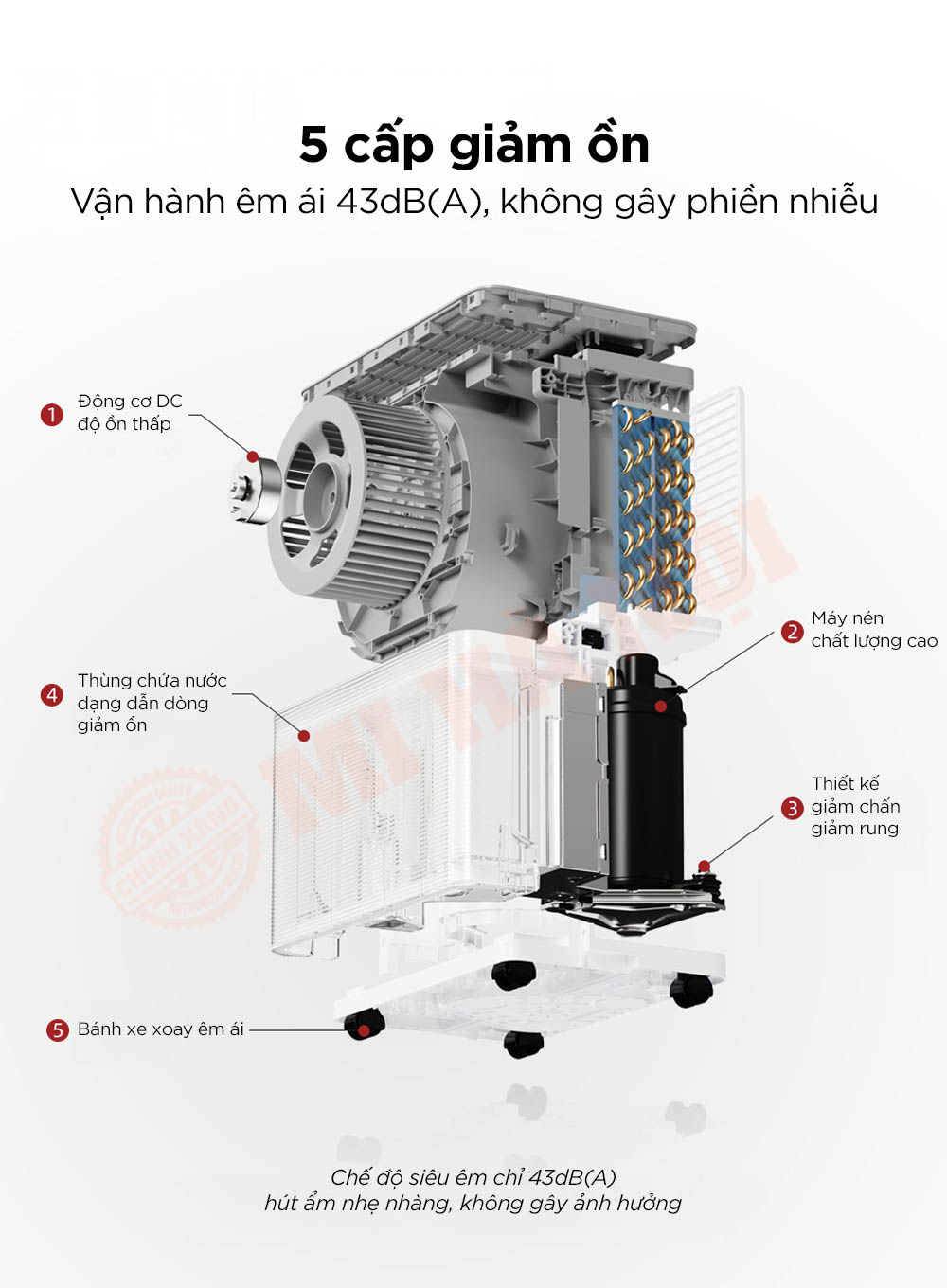 - Hoạt động êm ái nhờ hệ thống 5 cấp độ giảm ồn, độ ồn chỉ 43dB(A).