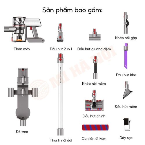 Phụ kiện đầy đủ. Thích nhất chỗ máy hút bụi là có đầu hút motor, có chổi xoay rất sạch, cả đầu hút sàn và đầu hút nệm/sofa đều có chổi xoay (tiếc là chưa có thiết kế chống rối tóc)