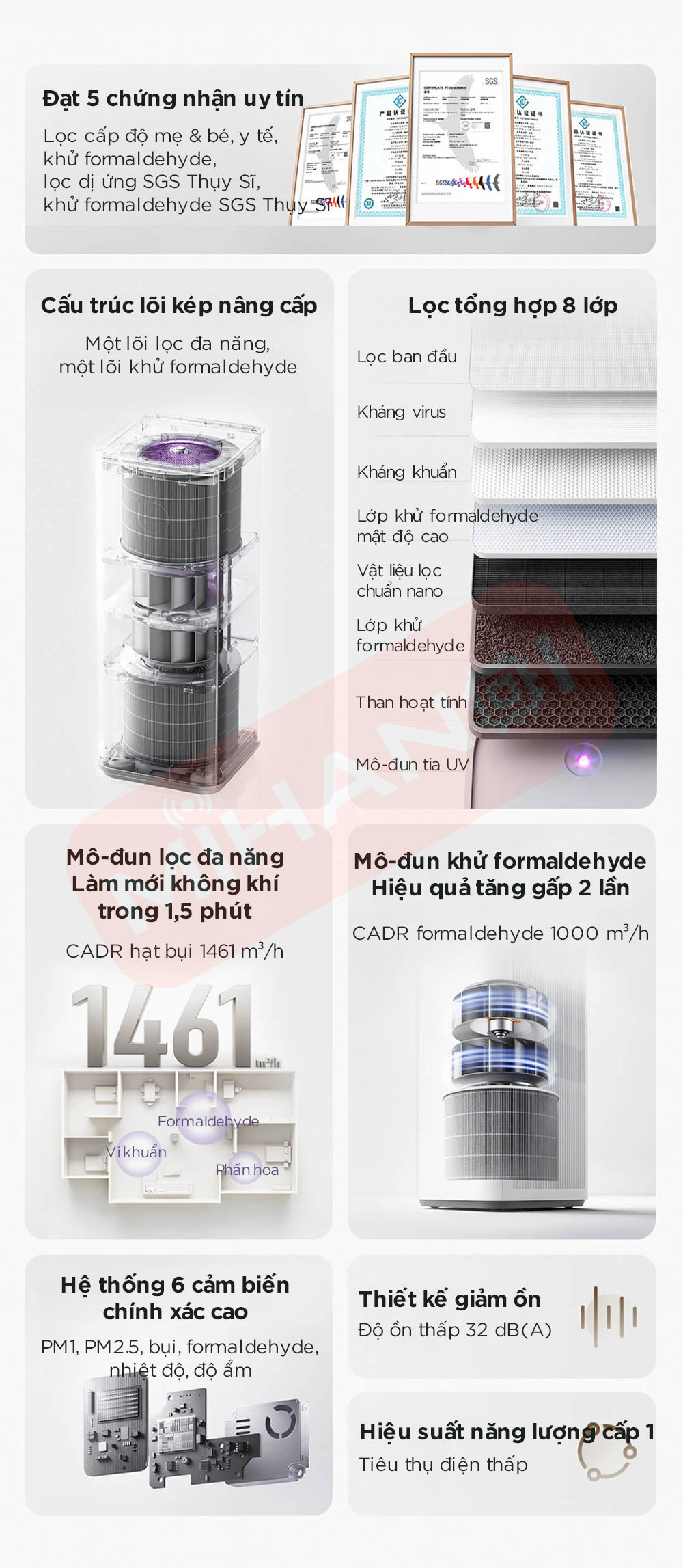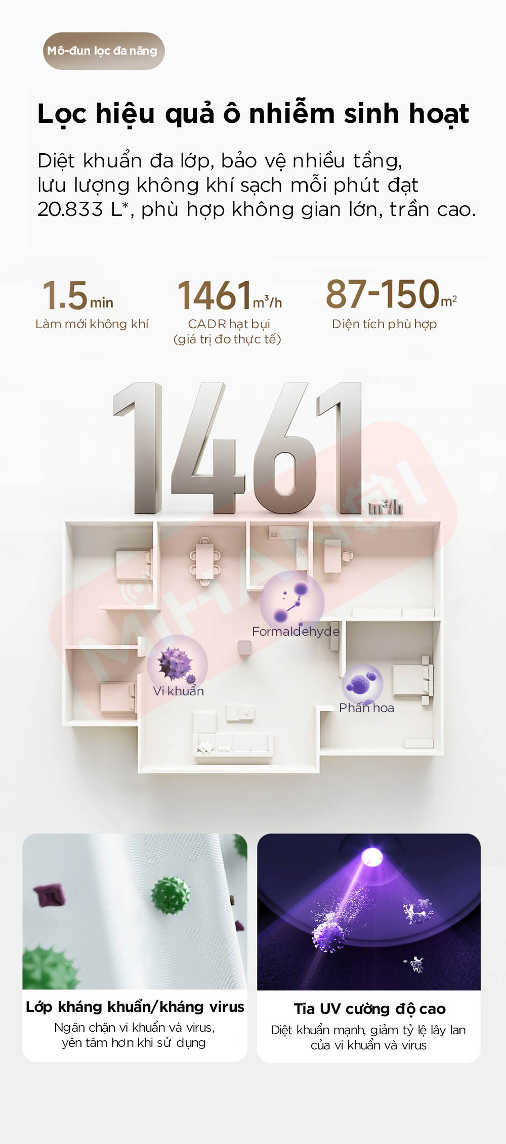 • CADR hạt bụi đạt 1461 m³/h, giúp làm mới toàn bộ không khí chỉ trong 1,5 phút.