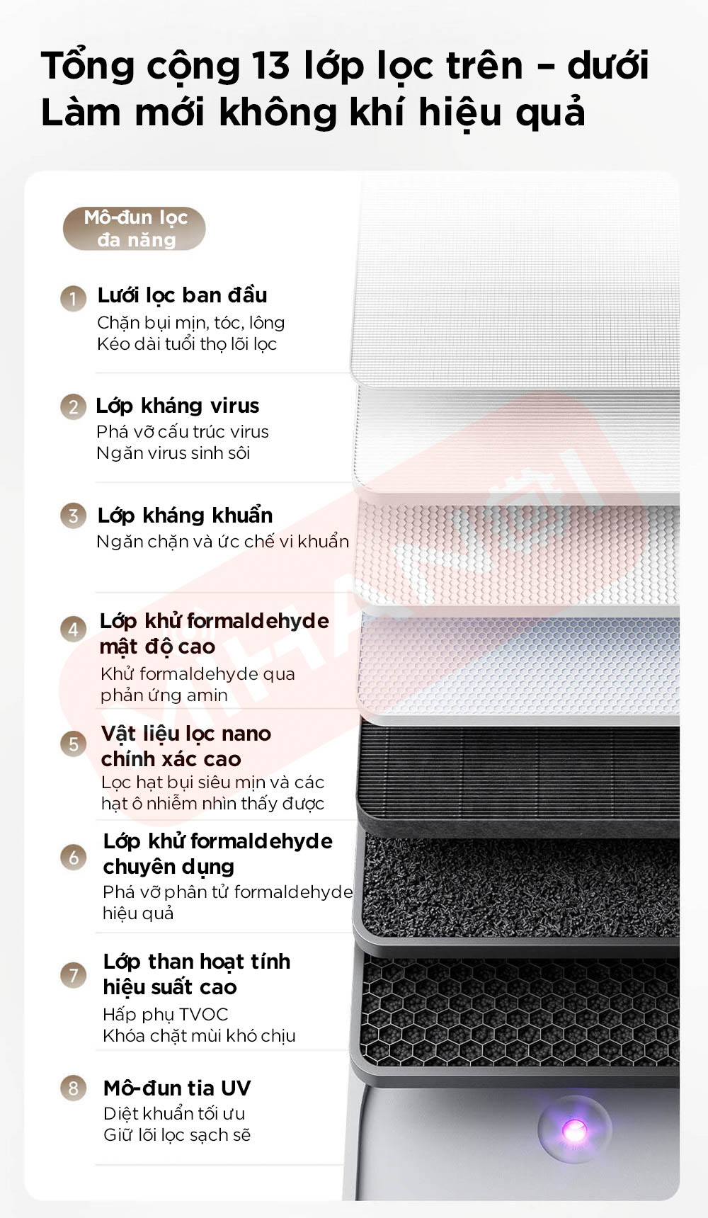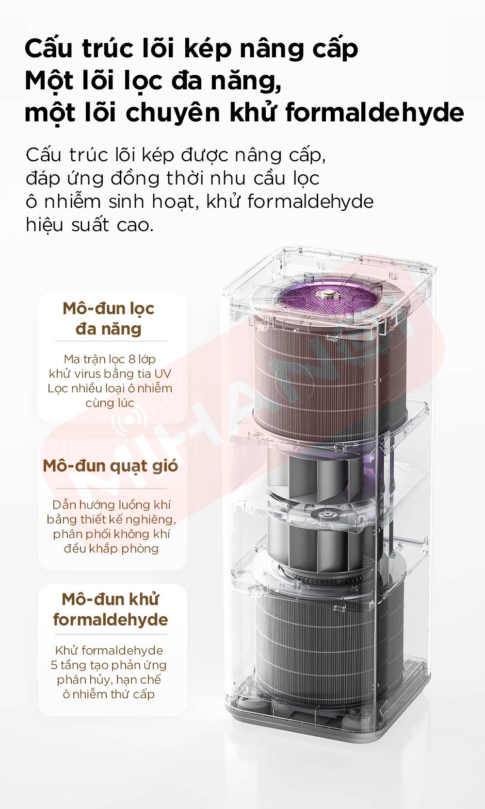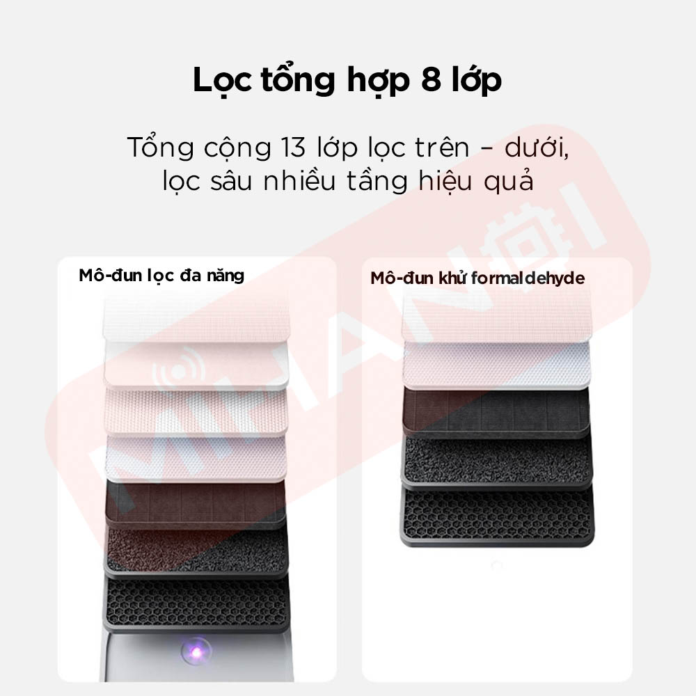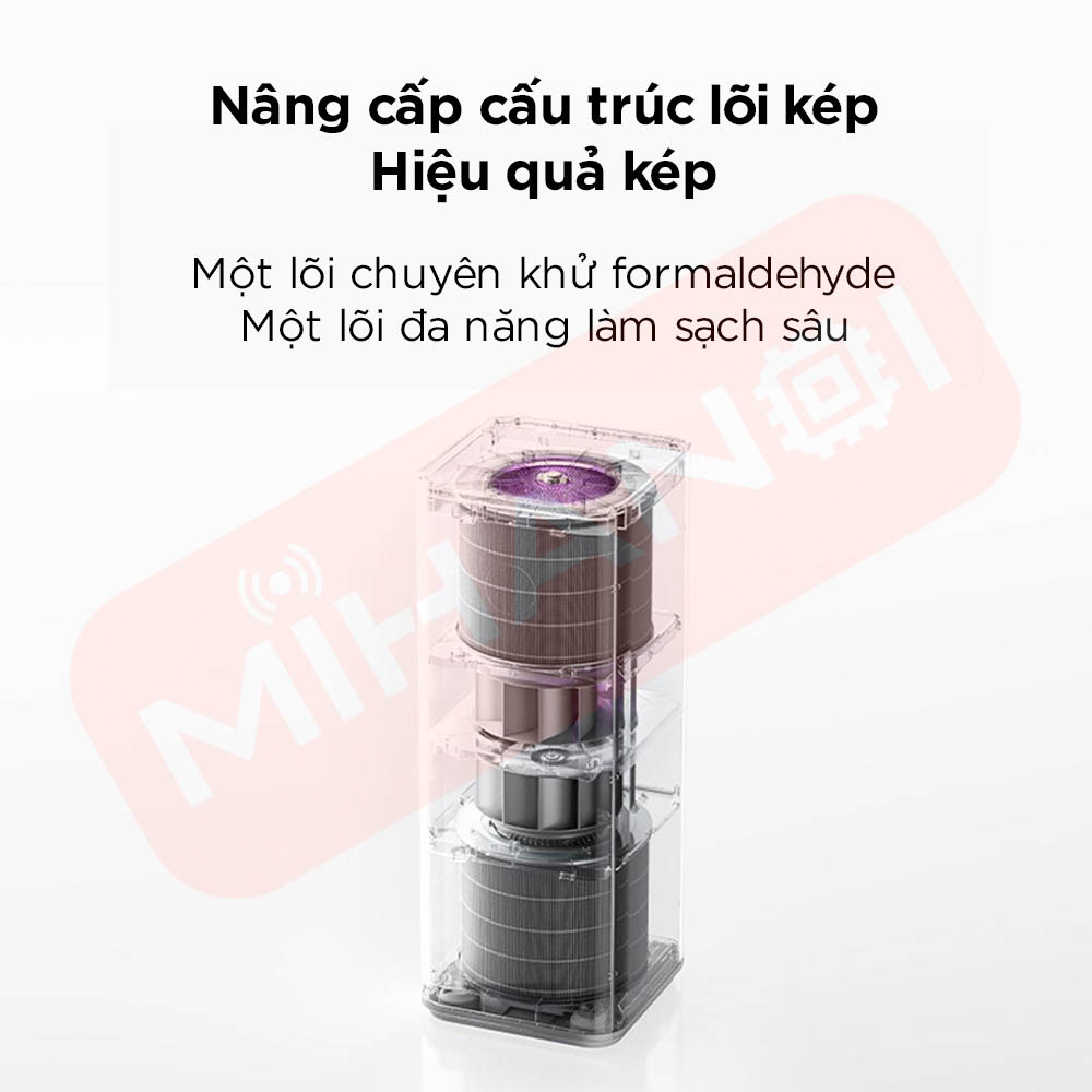 • Cấu trúc lõi lọc kép nâng cấp, lõi trên lọc đa tác dụng, xử lý hiệu quả các ô nhiễm sinh hoạt hằng ngày, lõi dưới chuyên khử formaldehyde hiệu suất cao, tối ưu cho nhà mới.