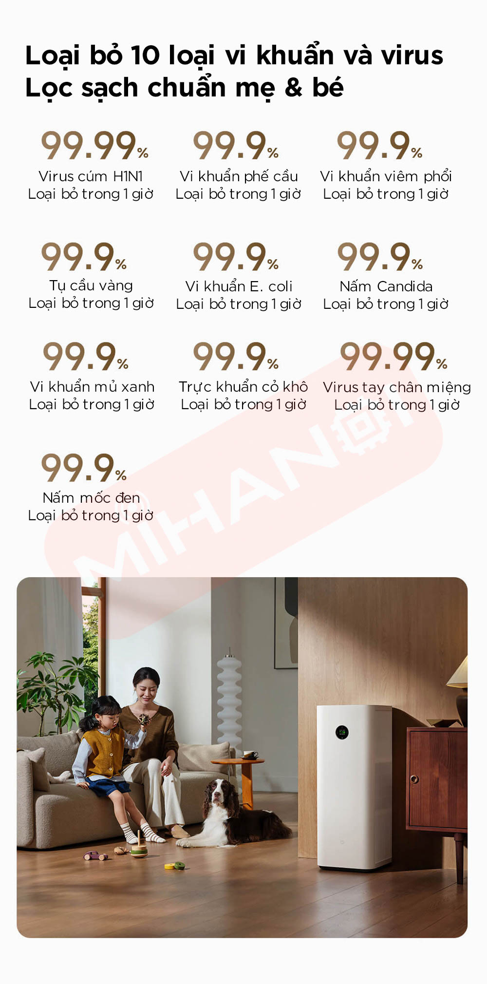 • Loại bỏ nhiều vi khuẩn và virus, đạt tiêu chuẩn máy lọc không khí mẹ & bé.