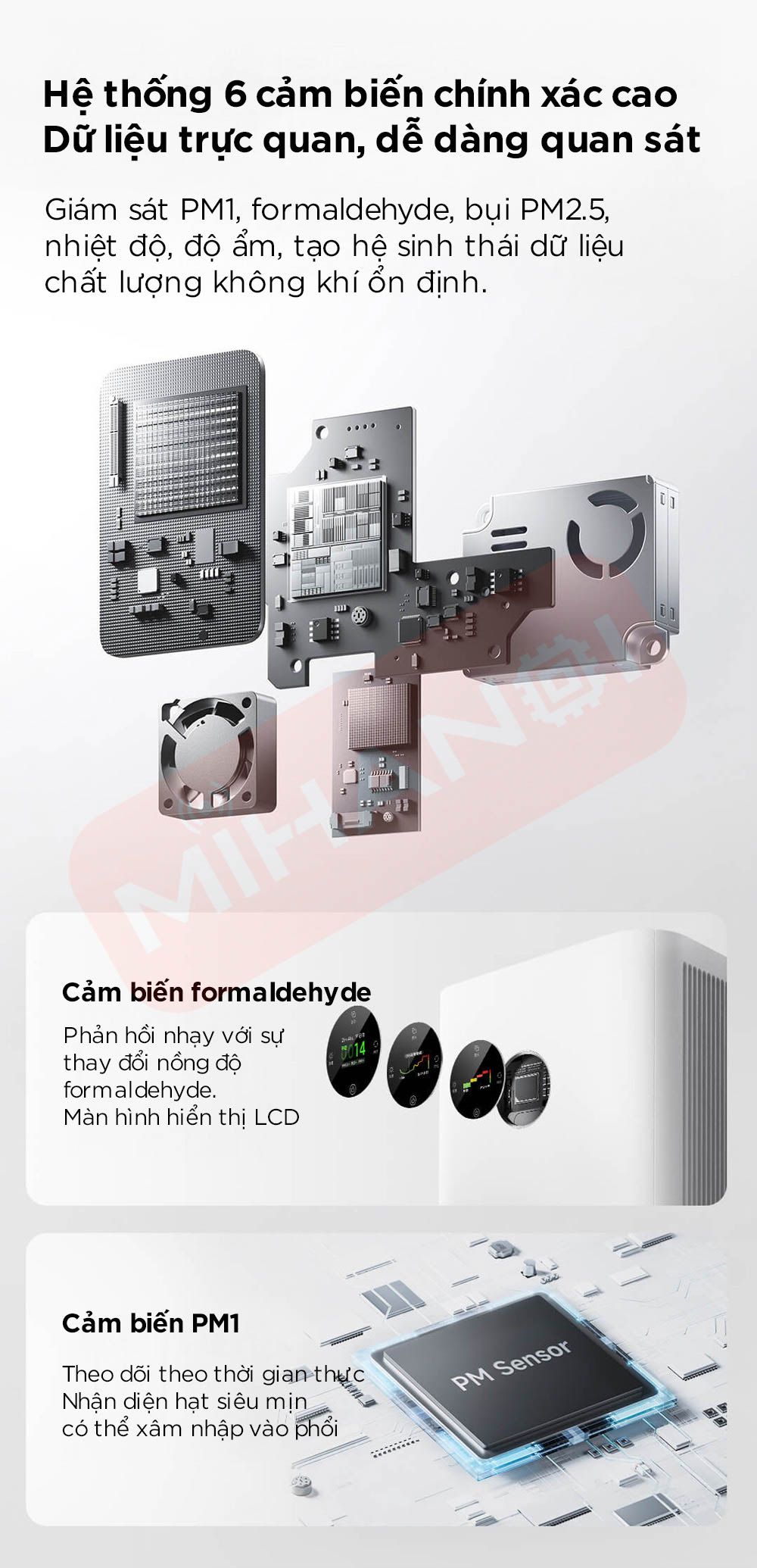 • Hệ thống 6 cảm biến theo dõi PM1, PM2.5, bụi, formaldehyde, nhiệt độ và độ ẩm.