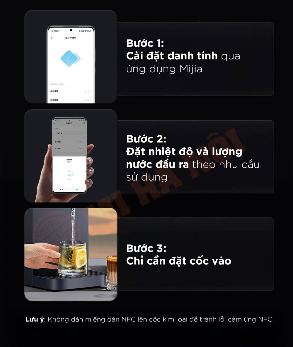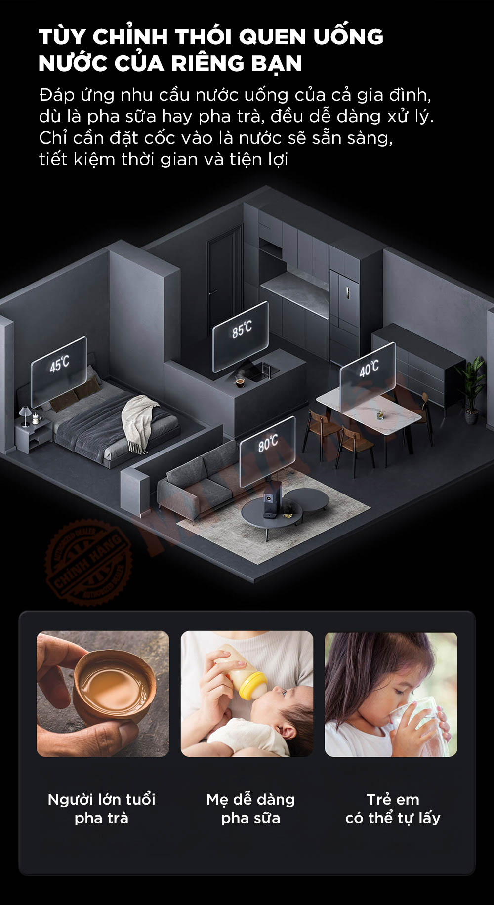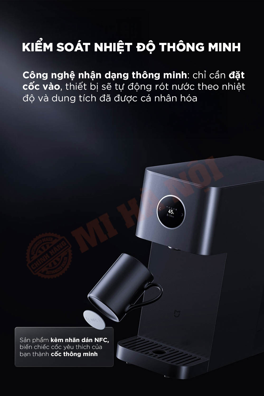 - Trải nghiệm thông minh, tiện lợi, chỉ cần đặt cốc vào máy là có ngay nước sạch theo lượng và nhiệt độ ghi nhớ.