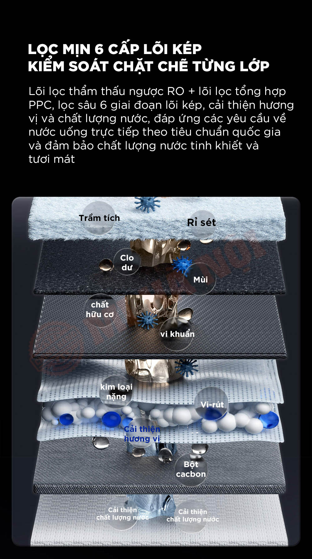 - Bộ lọc mịn sáu cấp lõi kép, loại bỏ hoàn toàn các chất có hại, vi khuẩn và kim loại nặng.