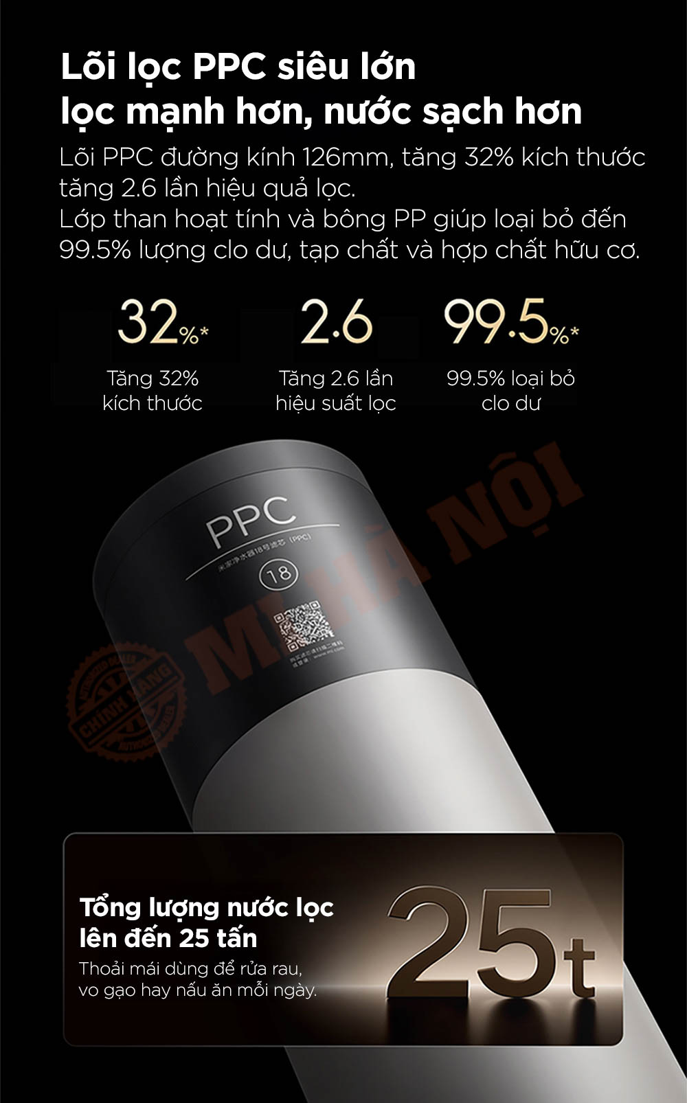 - Lõi lọc PPC siêu lớn tăng 32% kích thước, lọc nhanh hơn, hiệu quả cao hơn, bền lâu.