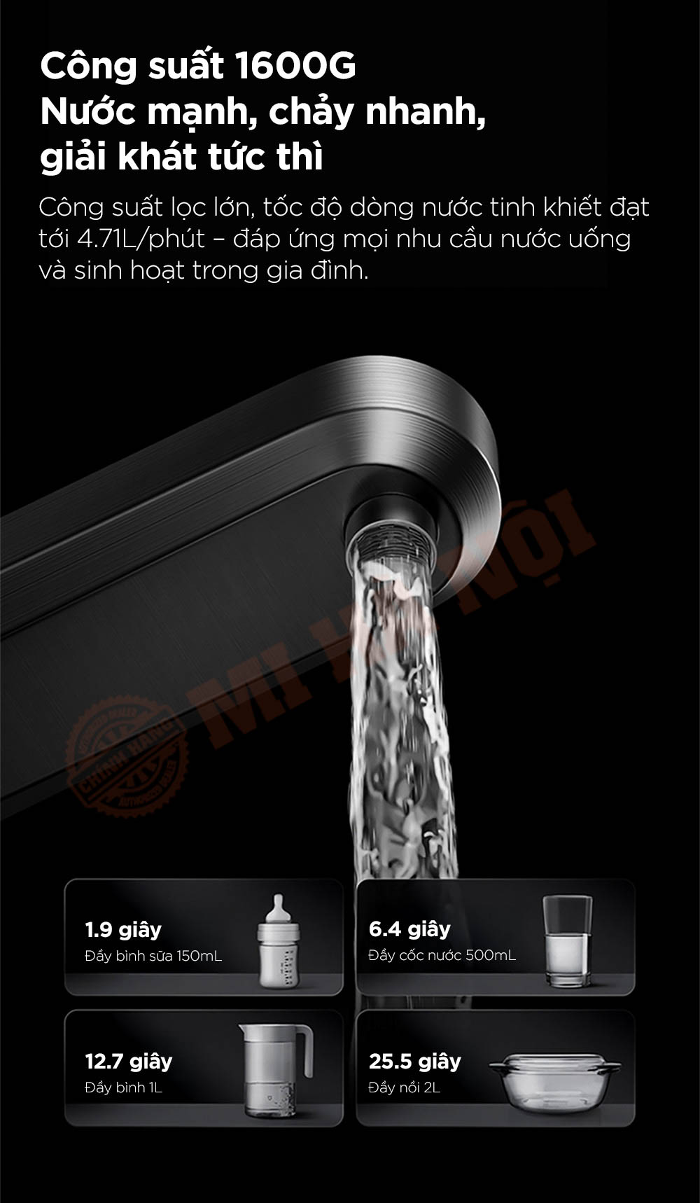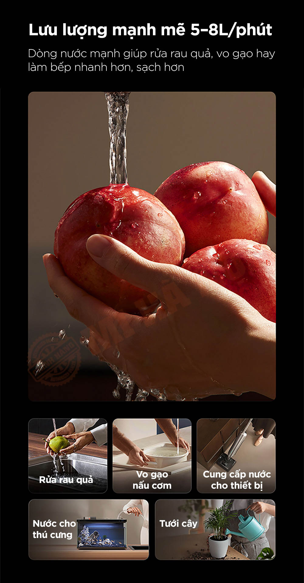- Lưu lượng nước mạnh mẽ 5–8L/phút, đáp ứng nhanh chóng nhu cầu uống và sinh hoạt hằng ngày.