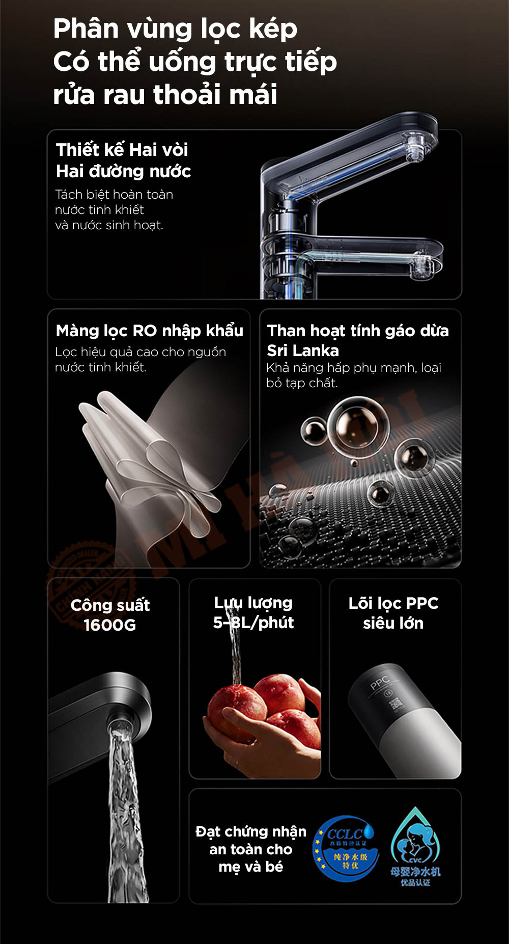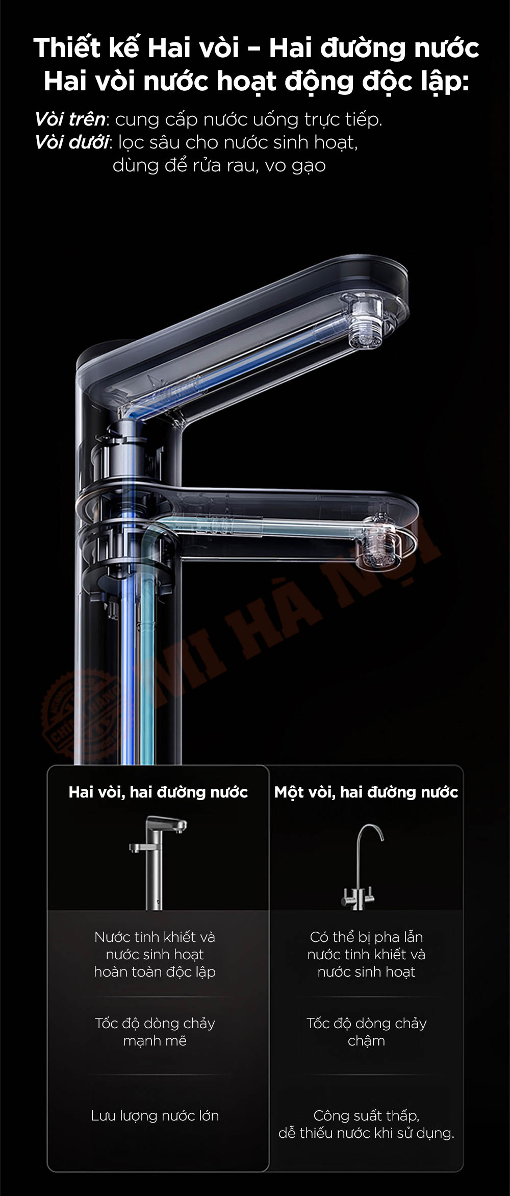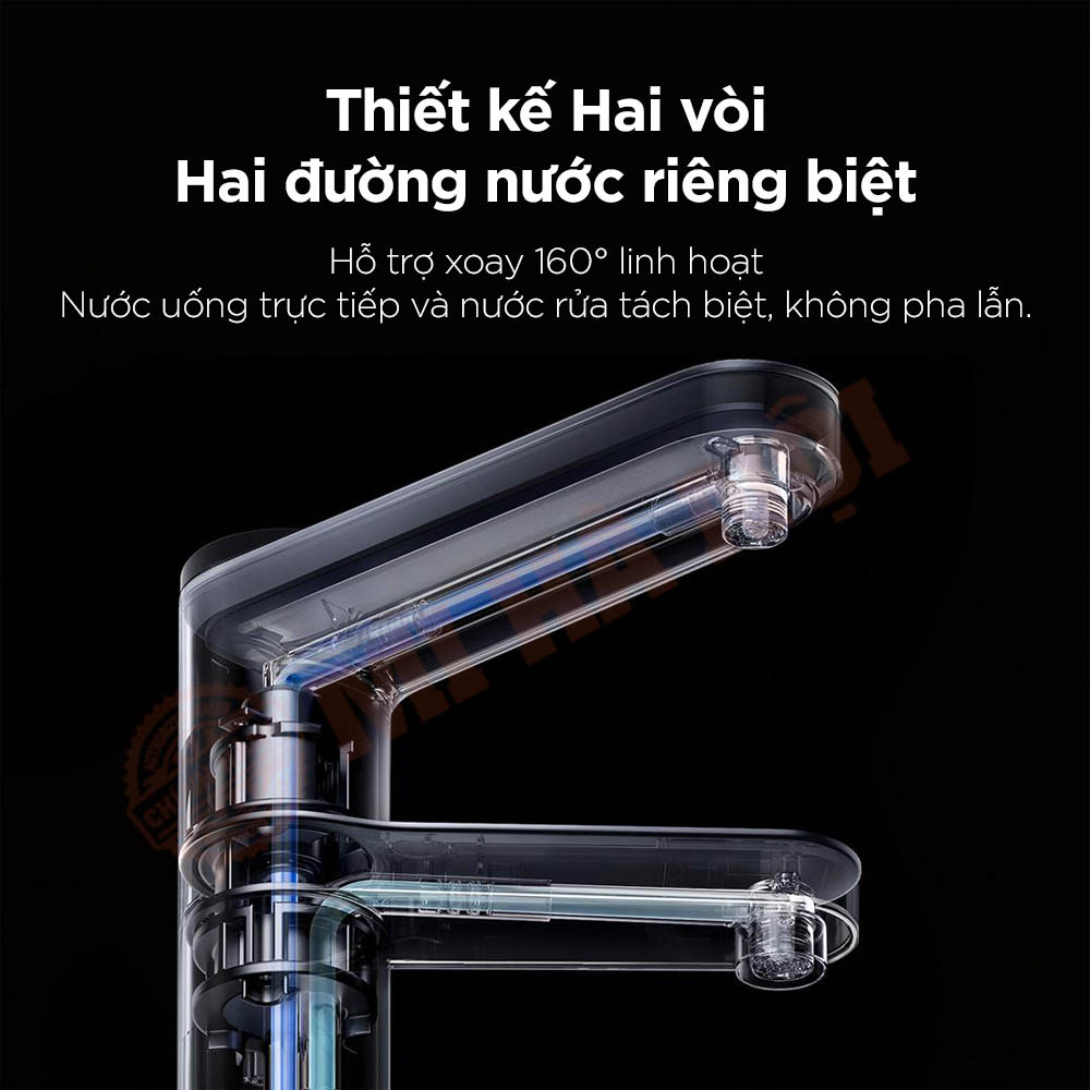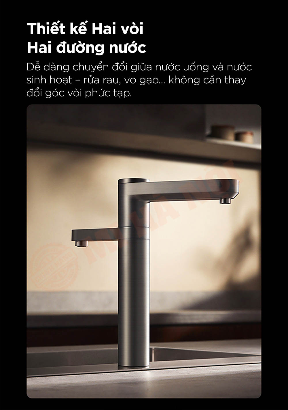 - Công nghệ “Hai vòi – Hai đường nước” tách biệt hoàn toàn nước uống và nước sinh hoạt, đảm bảo an toàn cho sức khỏe.
