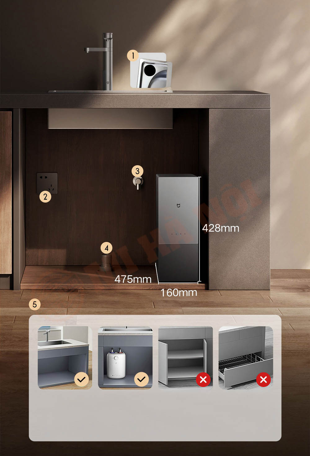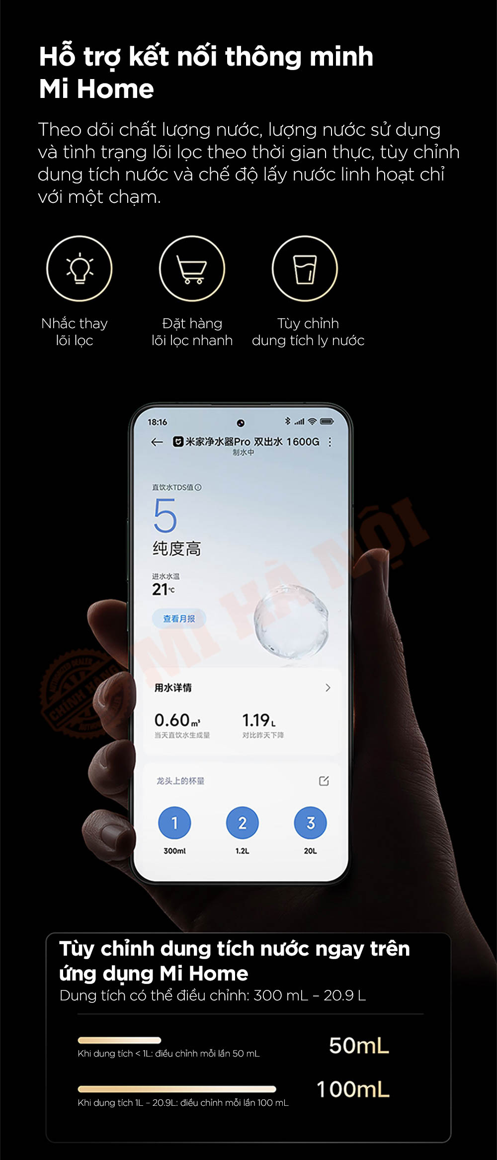 - Kết nối thông minh Mi Home, theo dõi chất lượng nước, lượng nước sử dụng và trạng thái lõi lọc theo thời gian thực.