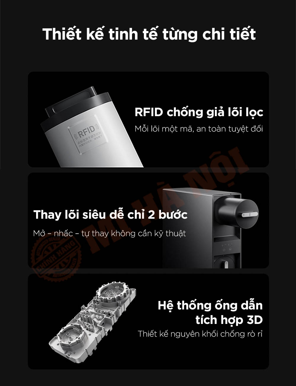 - Hệ thống ống dẫn 3D nguyên khối, chống rò rỉ và dễ dàng thay lõi chỉ trong 2 bước.